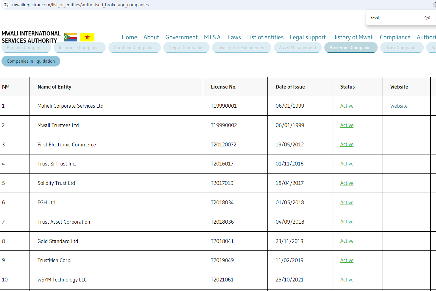 According to its website, it claims to be registered in the Comoros. Upon investigation, no matching information was found in the MWALI INTERNATIONAL SERVICES AUTHORITY (MISA). Therefore, Fexsi is clearly a scam. Therefore, Fexsi is clearly a scam.