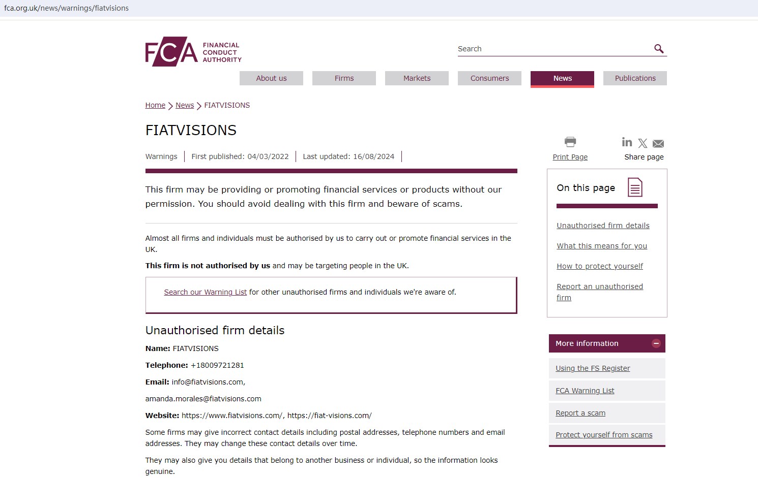 On 16 August 2024, the United Kingdom Financial Conduct Authority (FCA) issued a warning against Fiatvisions (fiat-visions.com), believing this company might be providing financial services or products without authorisation in the UK. You may visit: https://www.fca.org.uk/news/warnings/fiatvisions.