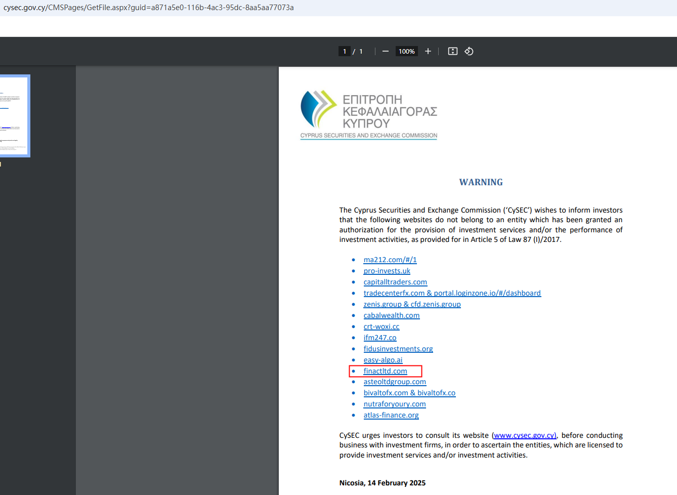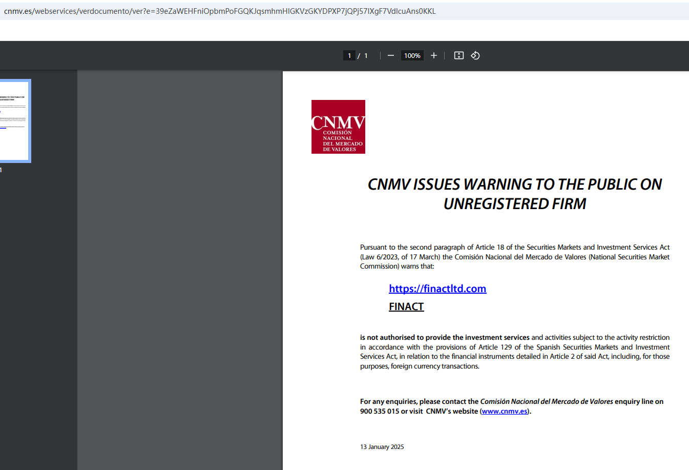 In addition, the National Securities Market Commission (CNMV) issued a warning against Finactltd, believing this company might be providing financial services or products without proper authorization.