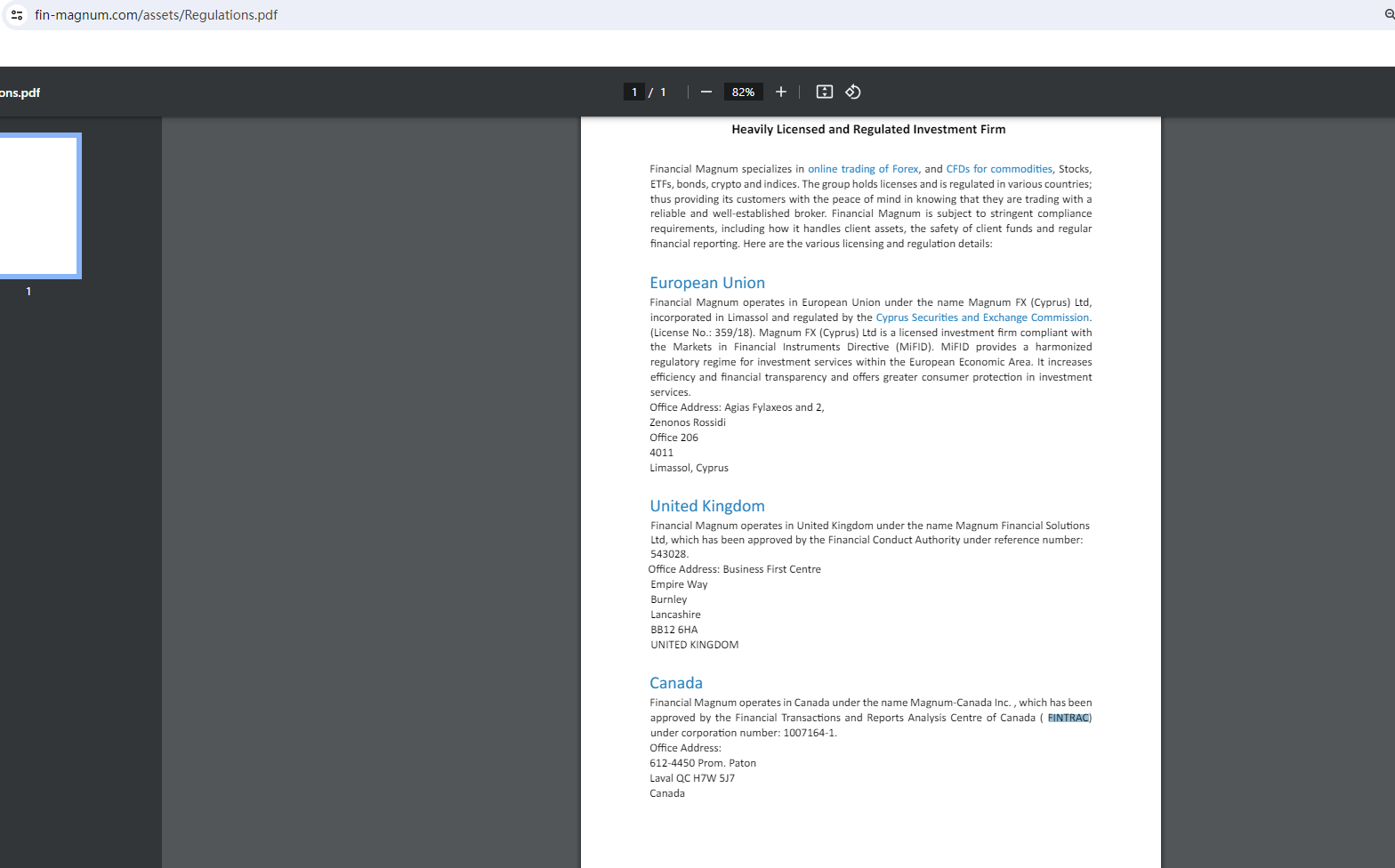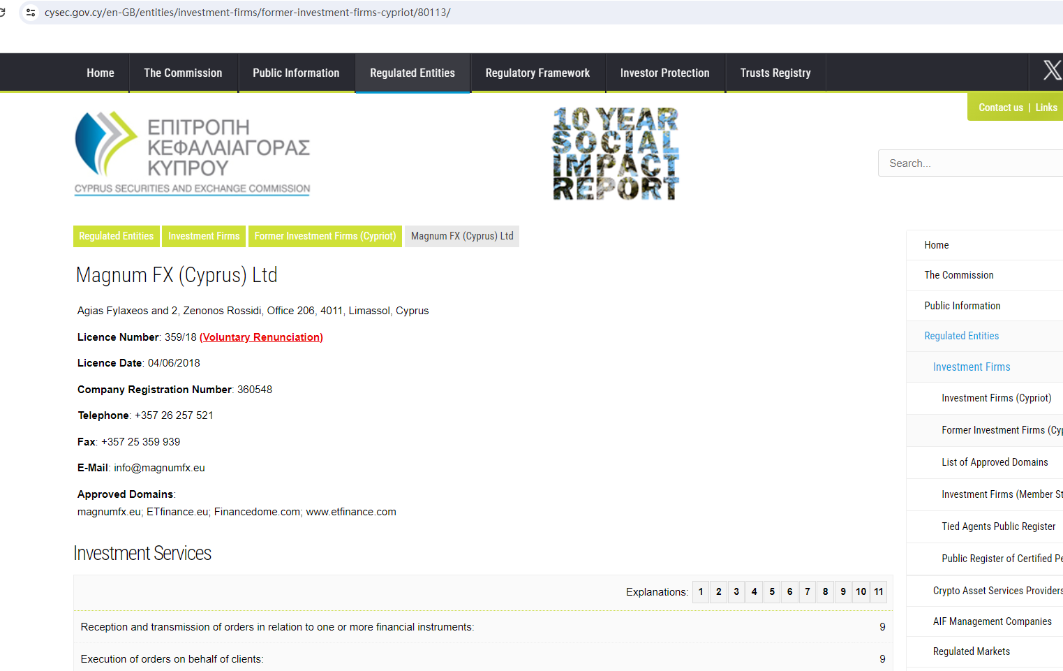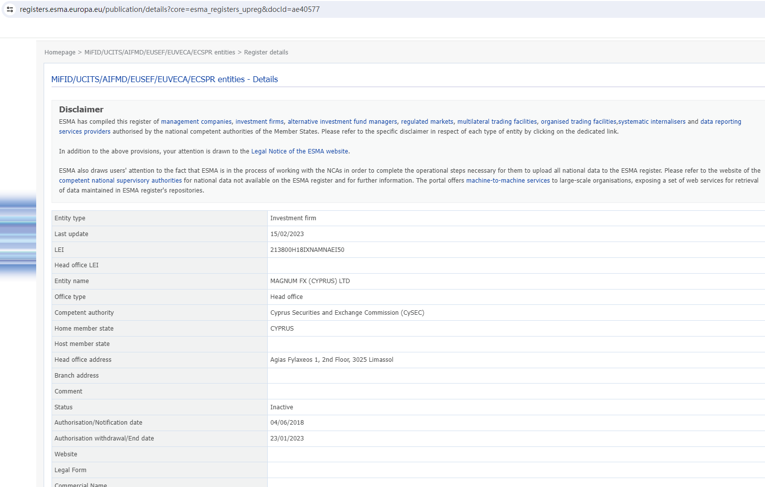 According to its website, it claims to be regulated by the Cyprus Securities and Exchange Commission (CySEC) and the European Securities and Markets Authority (ESMA). Upon investigation, we found that the URL registered with the regulatory agency is inconsistent with Financial Magnum. The regulatory information of the joint dealer has been misappropriated. Moreover, the regulatory status marked by CySEC and ESMA is "inactive", which further proves that the regulation is ineffective. In addition, it claims to be registered with the Financial Transactions and Reports Analysis Center of Canada (FINTRAC), but FINTRAC is not a regulatory agency and does not have the right to supervise foreign exchange.