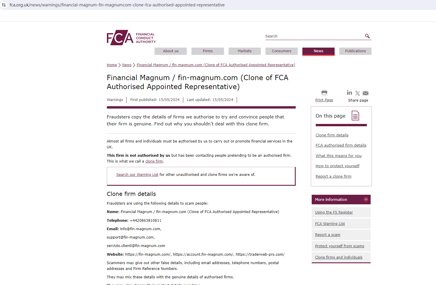 Furthermore, the Financial Conduct Authority (FCA) issued a warning against Financial Magnum, identifying this company as a clone of an FCA-authorized firm.