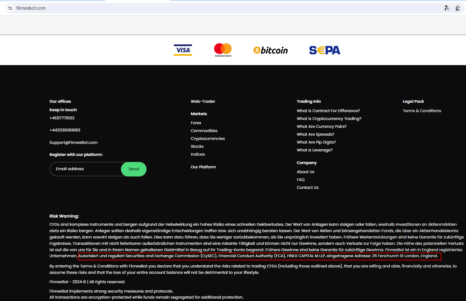FinnexBot claims to be regulated by the Cyprus Securities and Exchange Commission (CySEC) and Financial Conduct Authority (FCA).