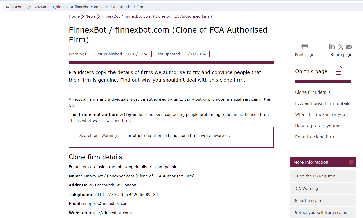 The United Kingdom Financial Conduct Authority (UK FCA) issued a warning that FinnexBot was a clone of FCA Authorised firm.