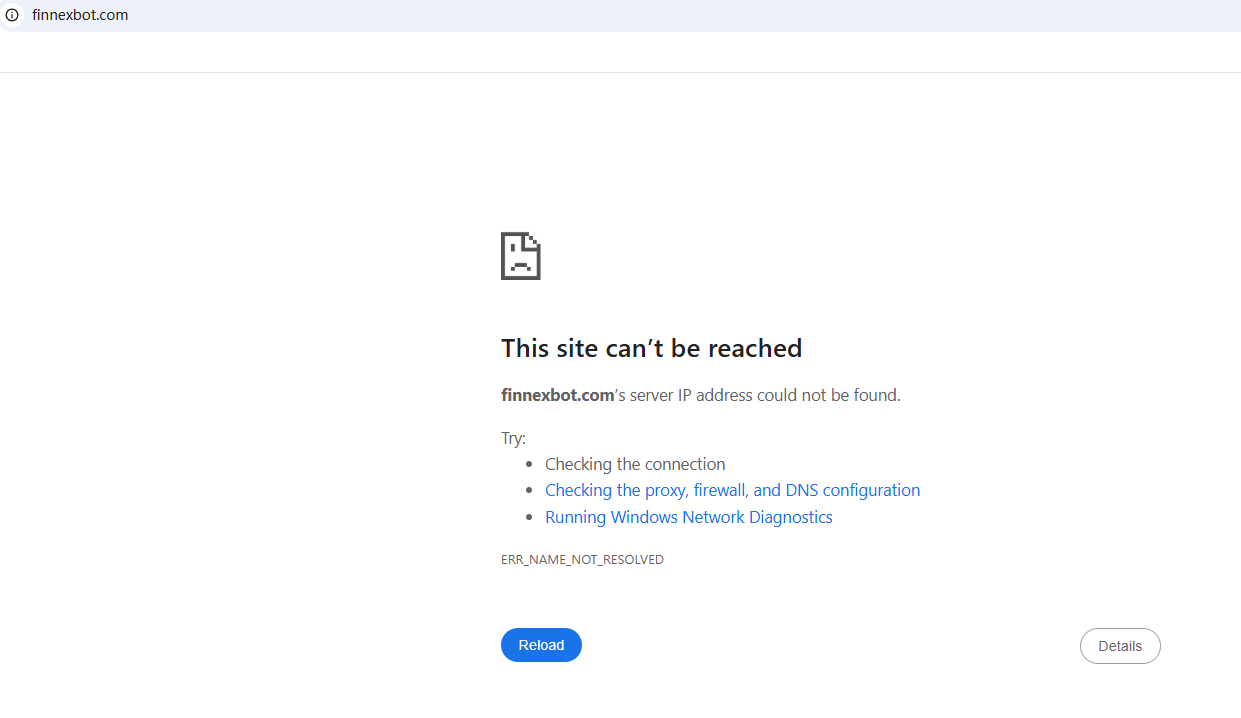 BrokersView found that the domain "https://finnexbot.com/" is currently inaccessible. This is widely regarded as a significant red flag, as the suspension of a broker's website often points to underlying regulatory or operational issues.