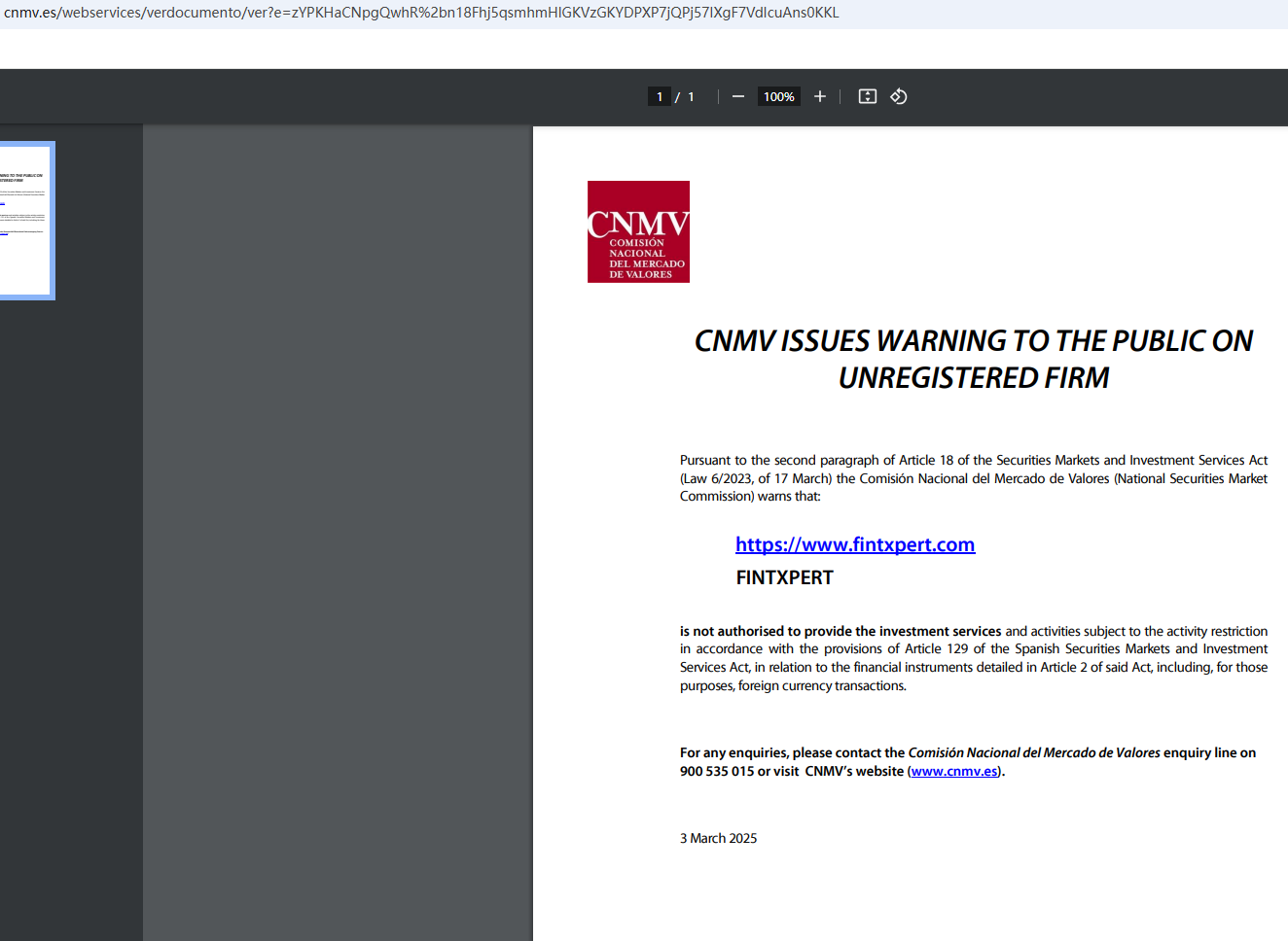 In addition, the National Securities Market Commission (CNMV) issued a warning against Fintxpert, believing this company might be providing financial services or products without proper authorization.