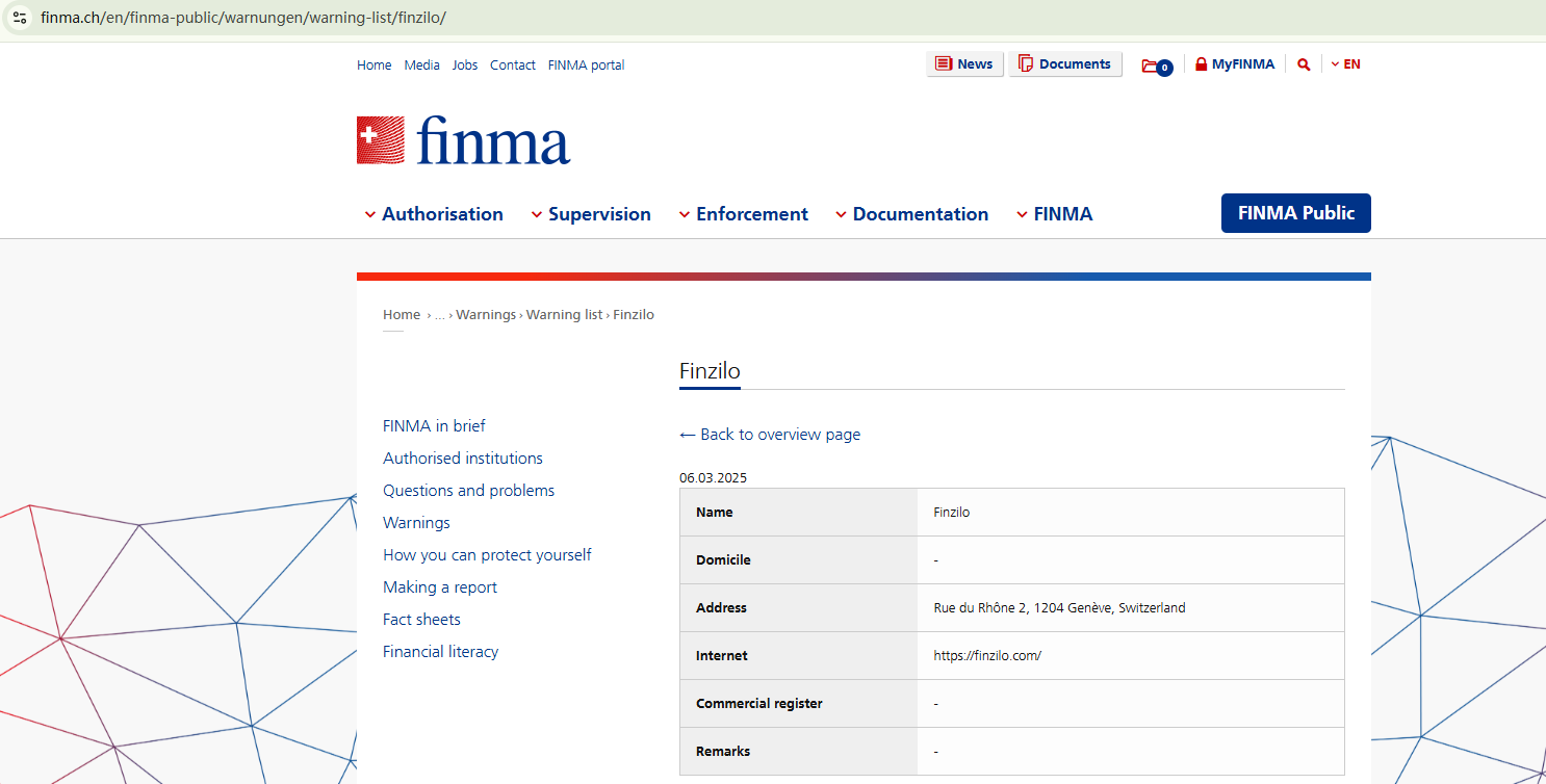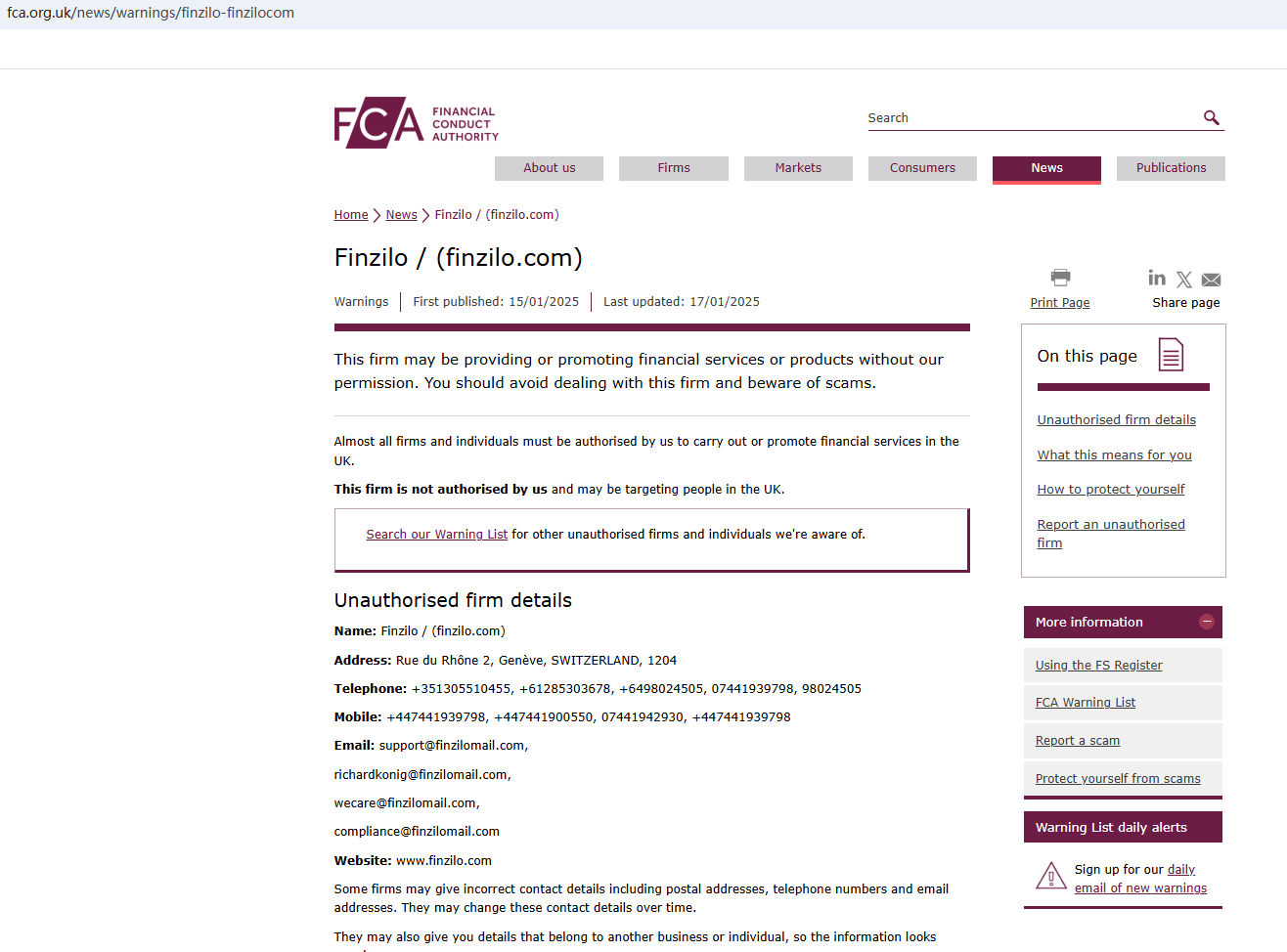 In addition, the Financial Conduct Authority (FCA) issued a warning against Finzilo, believing this company might be providing financial services or products without proper authorization in the UK.
