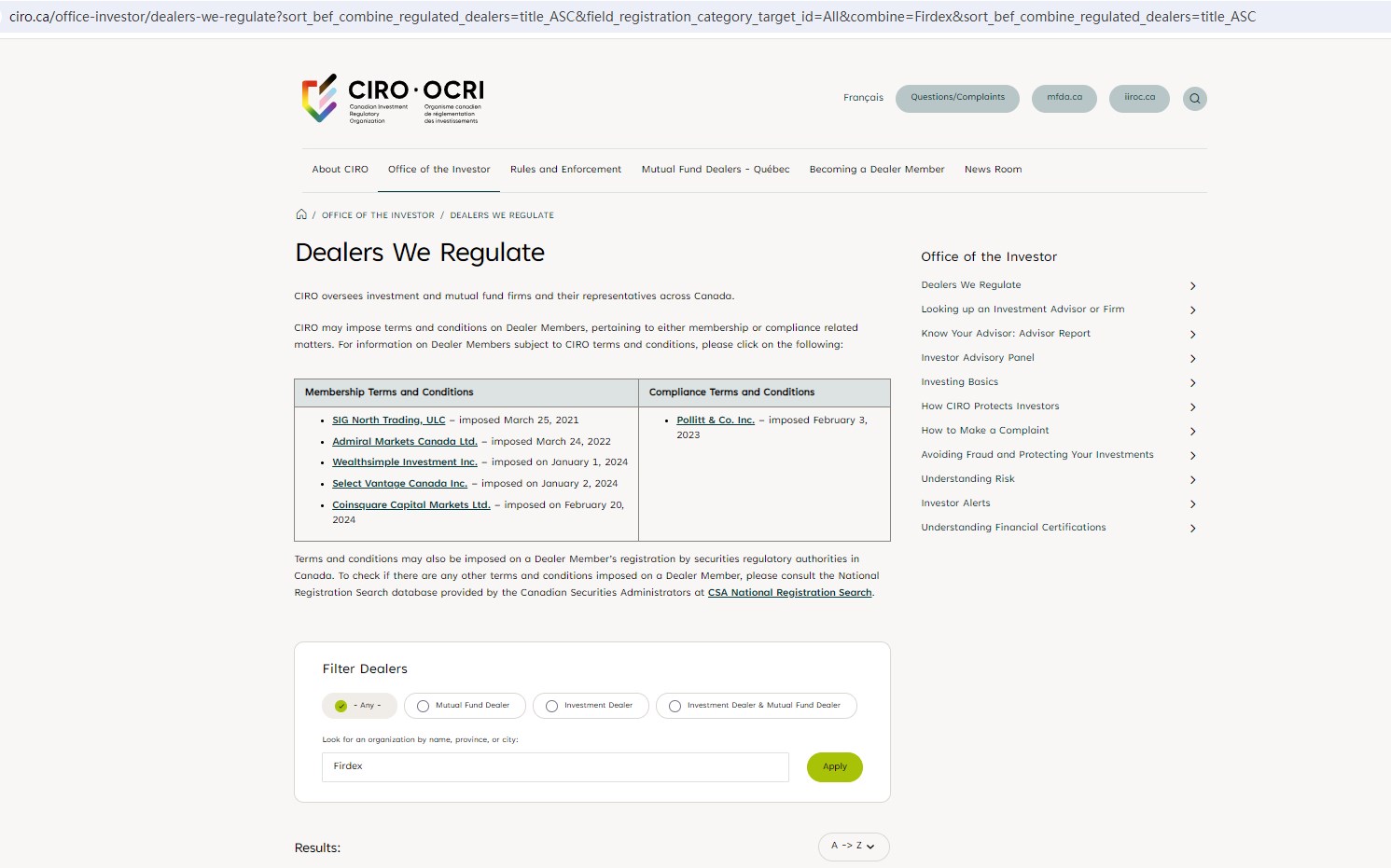 Upon investigation, we found that Firdex is not regulated by the Investment Industry Regulatory Organization of Canada (IIROC).