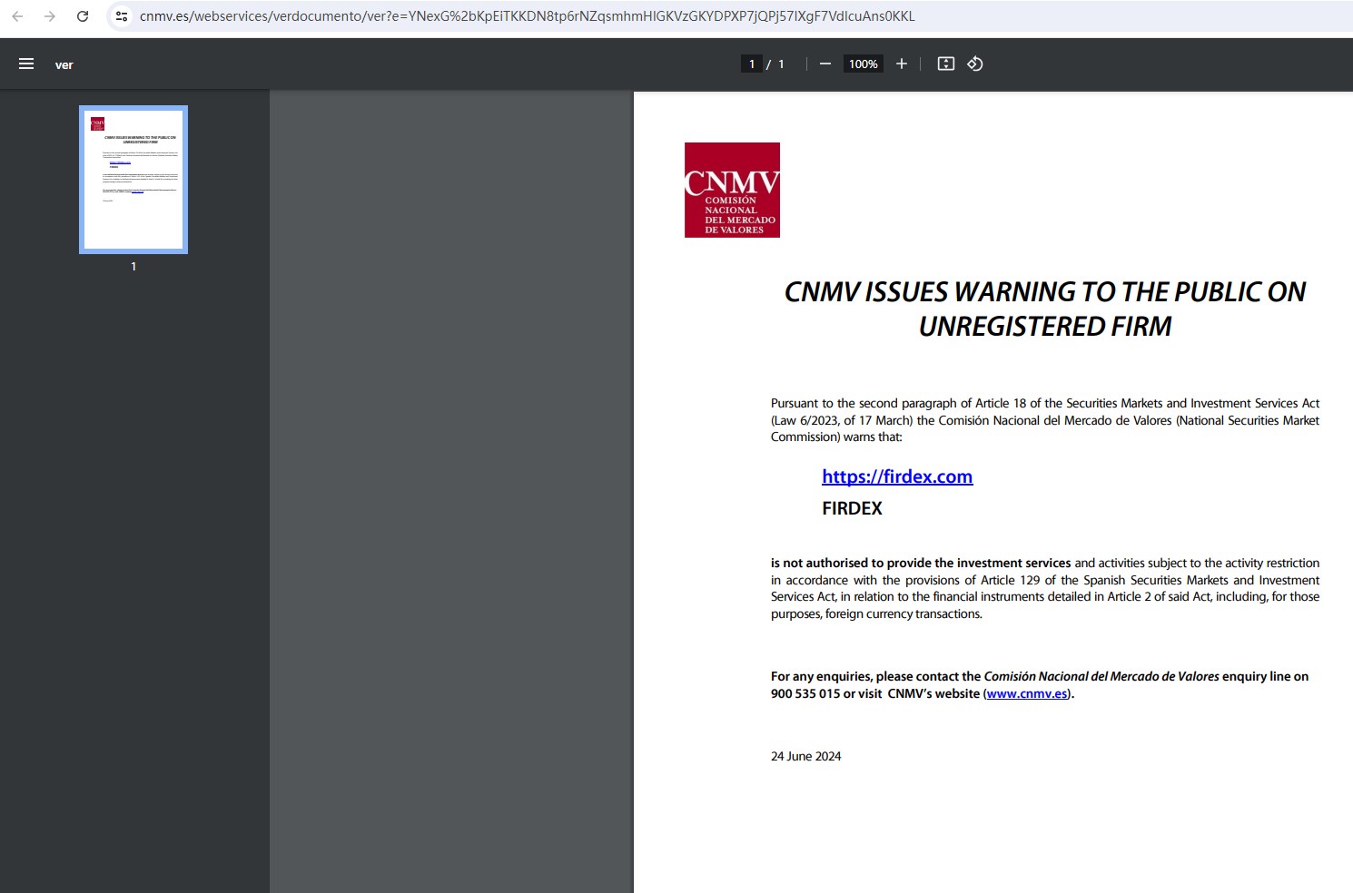 And the CNMV added FIRDEX (HTTPS://FIRDEX.COM) to its warning list for providing investment services without authorization.