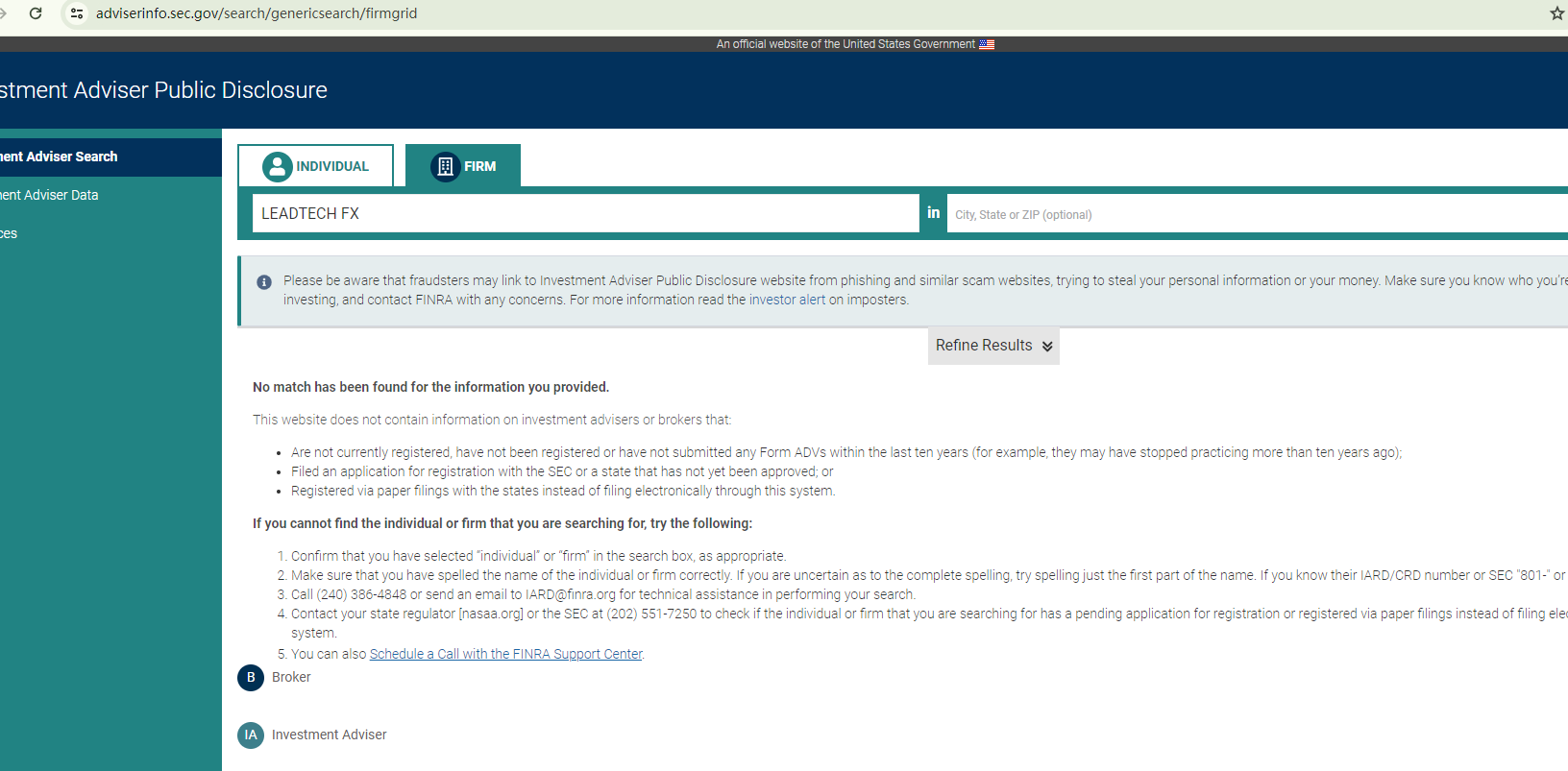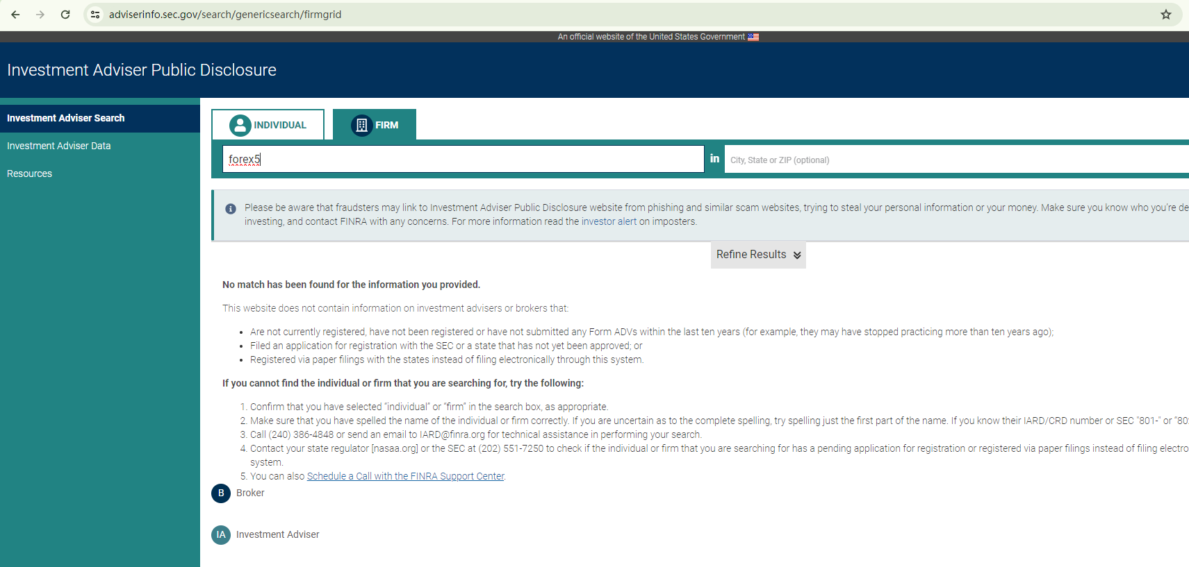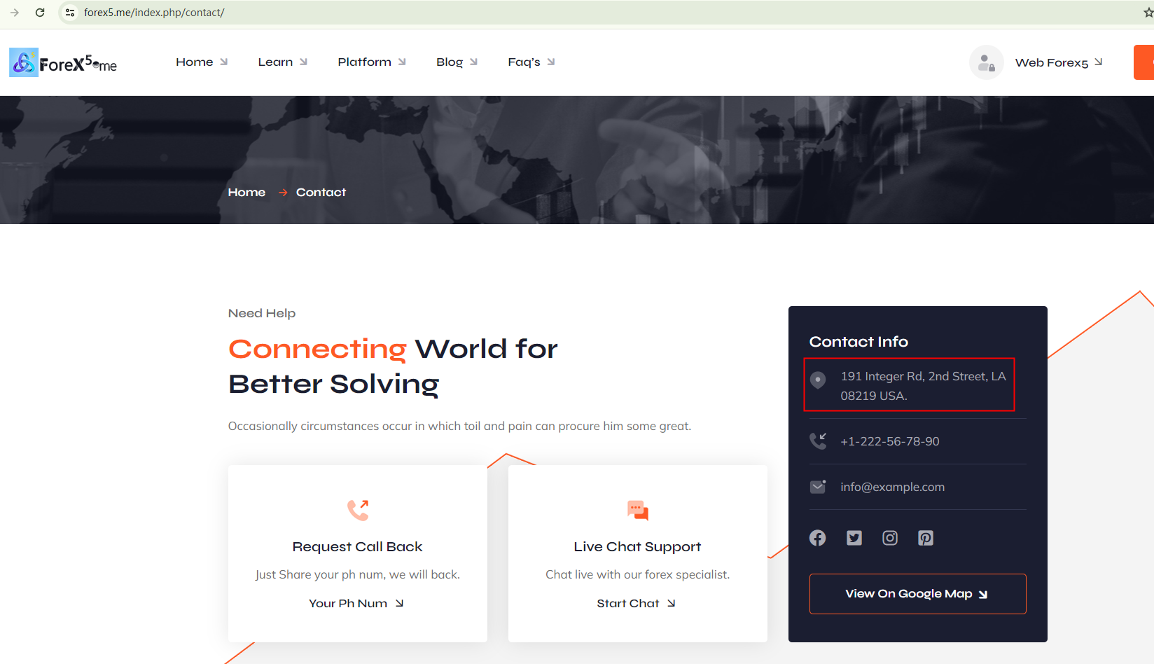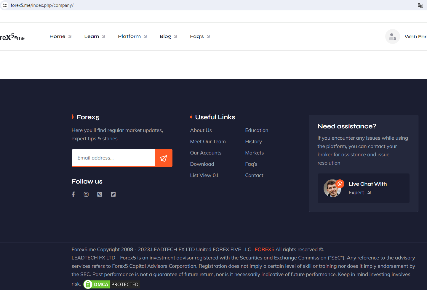 According to its website, Forex5.me is controled by LEADTECH FX LTD. It is an investment advisor registered with the Securities and Exchange Commission ("SEC"). Upon investigation, no matching information was found in the SEC. It is located in the USA. Upon investigation, no matching information was found in the National Futures Association (NFA).