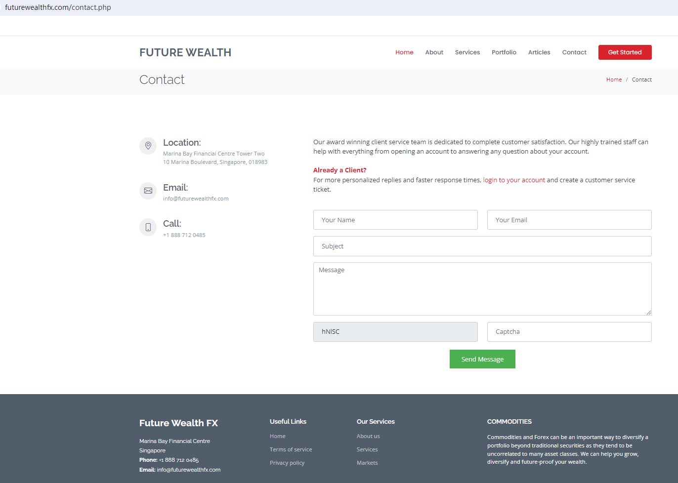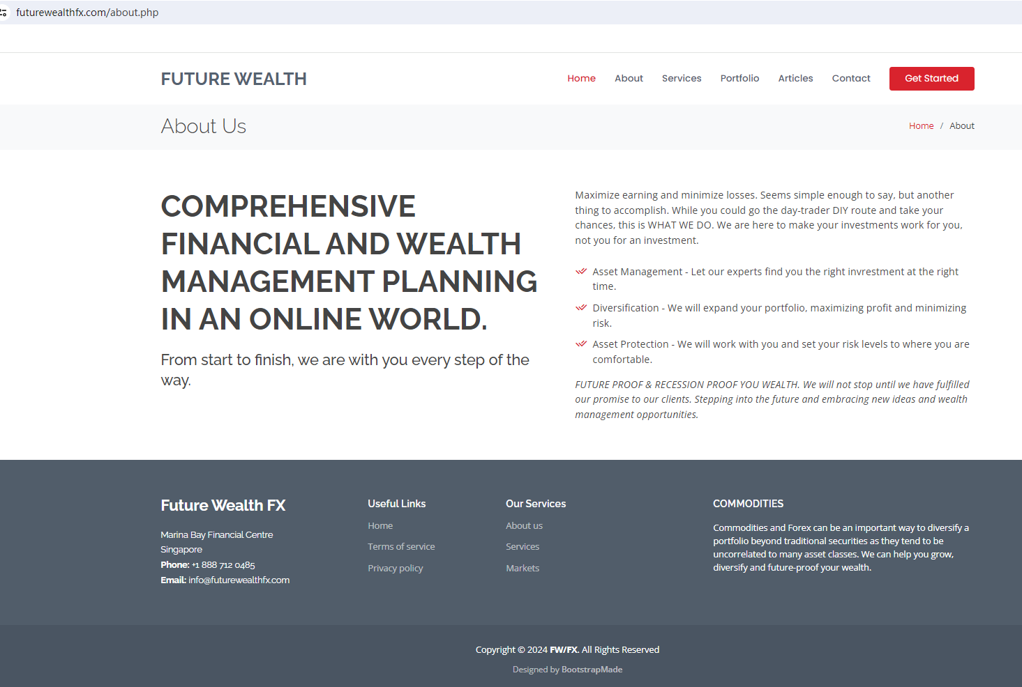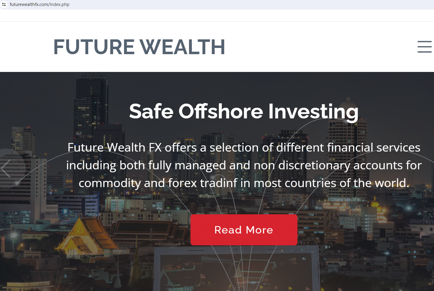 According to its website, it is located in Singapore. Upon investigation, no matching information was found in the Monetary Authority of Singapore (MAS).In addition, the British Columbia Securities Commission (BCSC) warned against Future Wealth FX, believing that Future Wealth FX is not registered to trade in, or advise on, securities or derivatives in BC. The truth is that Future Wealth FX is not regulated by any regulators. Letting it hold or control investors' money is unsafe, and the funds can not be protected by any laws.Future Wealth FX is a scam.