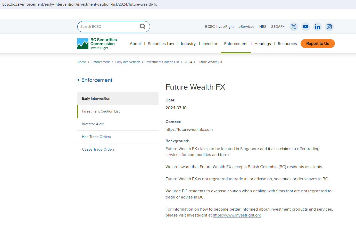 In addition, the British Columbia Securities Commission (BCSC) warned against Future Wealth FX, believing that Future Wealth FX is not registered to trade in, or advise on, securities or derivatives in BC.