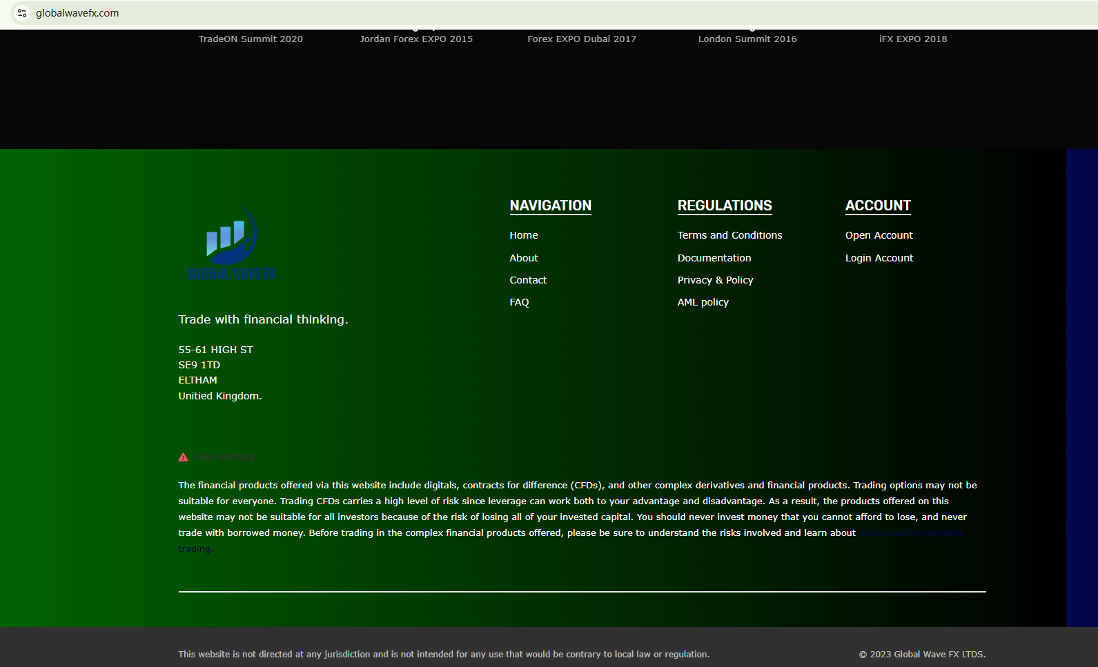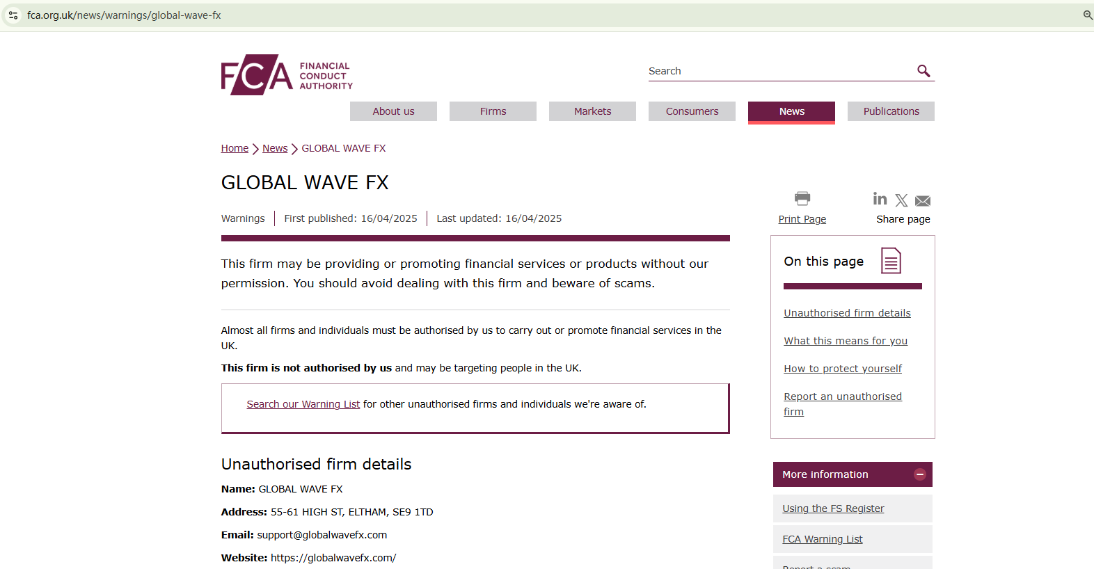 GLOBAL WAVE FX doesn't provide any information for verifying its legitimacy. While it claims to be located in the UK, there are no indications that it is registered with the Financial Conduct Authority (FCA). The FCA has issued a warning against GLOBAL WAVE FX for the lack of the required authorization.