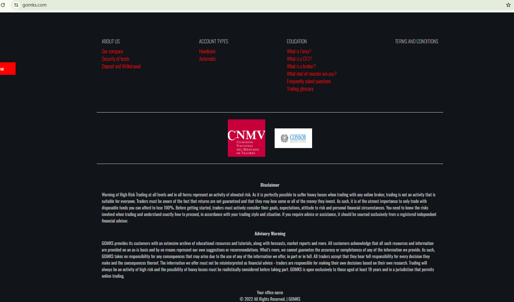 The broker's inconsistent self-referencing as both GOMKS and Go Markets is perplexing and raises questions about its authenticity.GOMKS purports to be regulated by the Cyprus Securities and Exchange Commission (CySEC), the Comisión Nacional del Mercado de Valores (CNMV), and the Italian Companies and Exchange Commission (CONSOB). This claim prompted us to search the register of the European Securities and Markets Authority (ESMA), a resource that provides access to relevant registers and statistical data for market participants, regulators, and the general public. However, our search yielded no matching records for GOMKS. While there is a "Go Markets Ltd" listed in the CySEC register, it is evident from the disclosed information of the license holder that GOMKS is not associated with this licensed entity.Furthermore, the Comisión Nacional del Mercado de Valores (CNMV) has added GOMKS to its warning list for providing investment services without the necessary authorization. This development further underscores the need for caution when dealing with GOMKS.In essence, GOMKS is not regulated by any governing body. Entrusting it with investors' funds is highly risky, as there are no legal protections in place to safeguard the funds.GOMKS appears to be a scam.