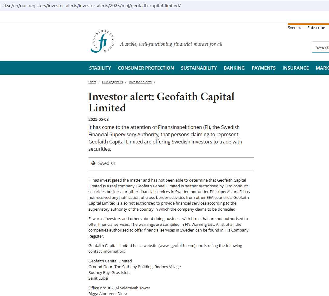 In addition, the Finansinspektionen (FI) issued a warning against Geofaith Capital Limited, suspecting that it is not a real company.