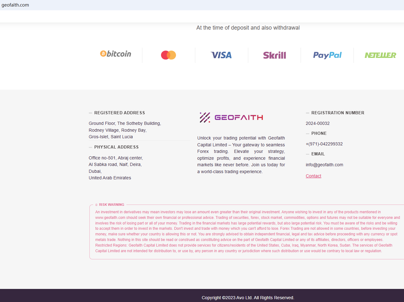 It claims that its registered address is in Saint Lucia, but its actual address is in Dubai. As we all know, Saint Lucia does not have an institution with the right to regulate foreign exchange, and we have checked the relevant institutions in Dubai but did not find any matching information in the Securities and Commodities Authority (SCA), the Dubai Financial Services Authority (DFSA) and Central Bank of the United Arab Emirates (CBUAE).