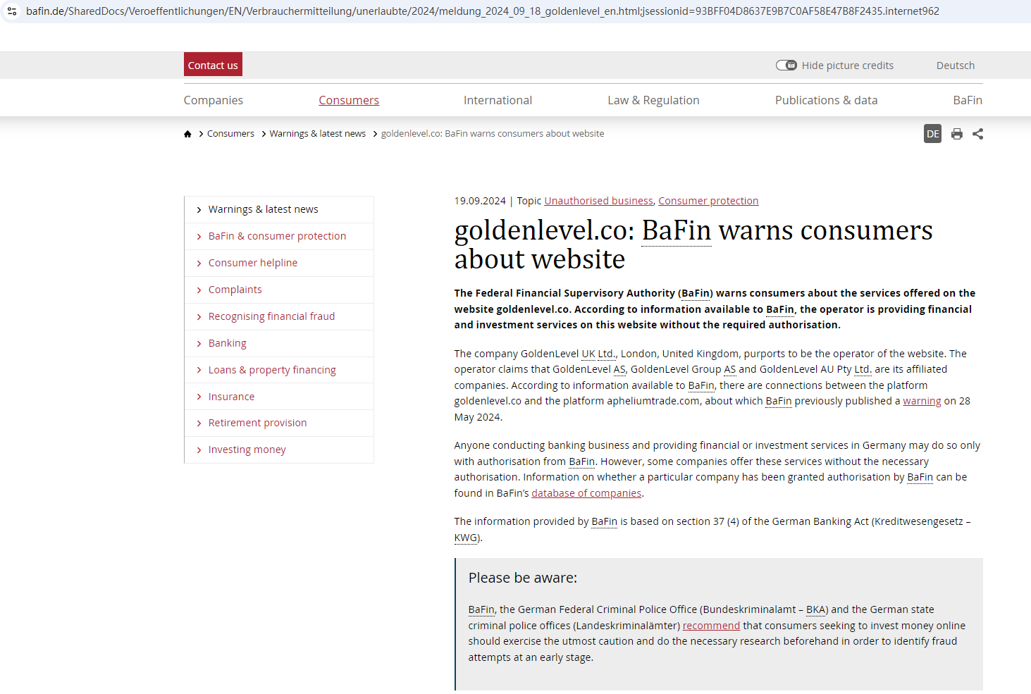 In addition, the Federal Financial Supervisory Authority (BaFin) warned consumers about the services offered by the company GoldenLevel (goldenlevel.co), which is offering financial and investment services without the required authorization.