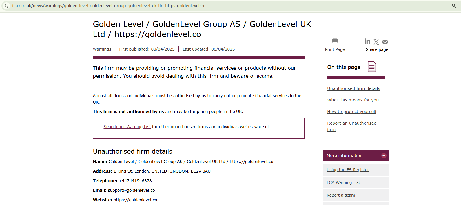 Therefore, entrusting GoldenLevel with your funds is risky due to its unregulated status.