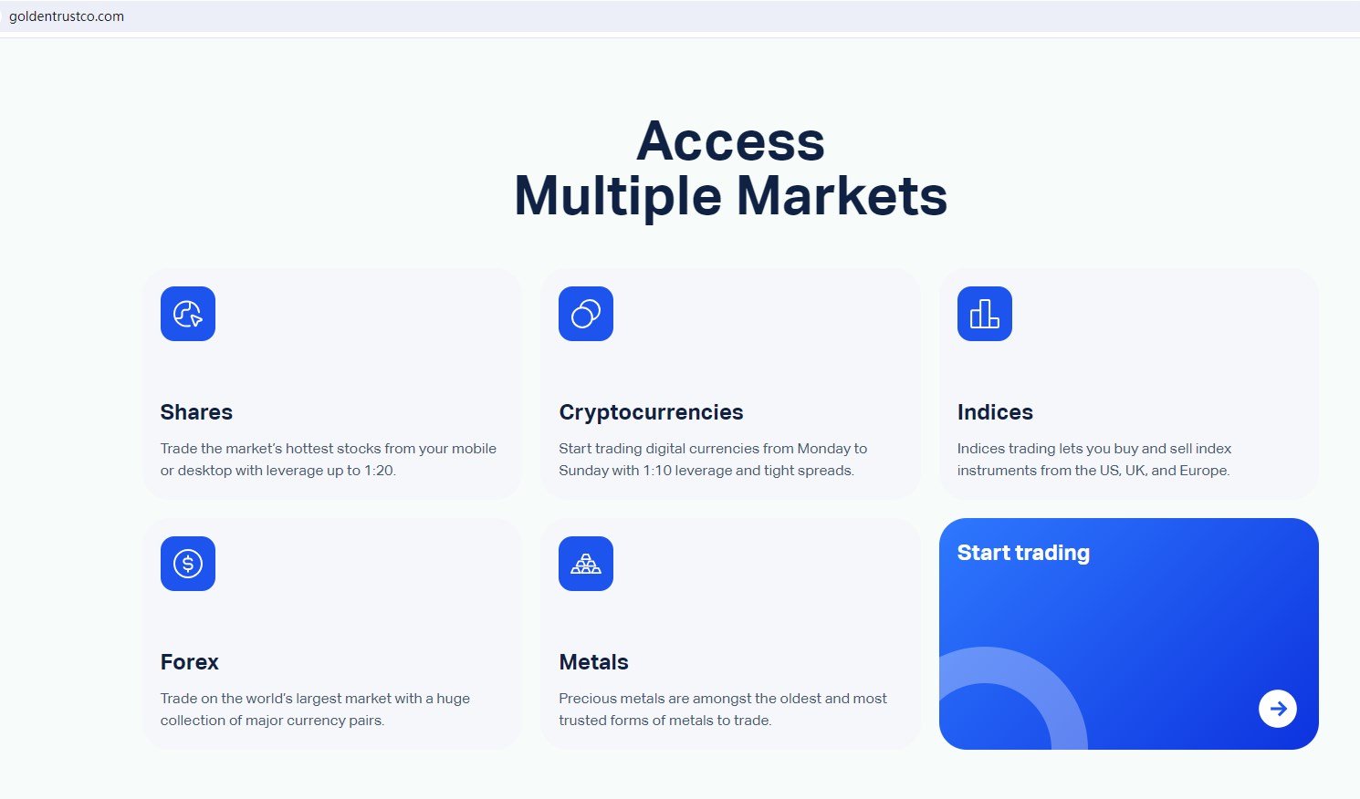 Goldentrustco (GOLDEN TRUST) claims to be a regulated company and financial services provider located in the Saint Vincent and Grenadines, offering wide range of financial services, including Shares, Cryptocurrencies, Indices, Forex, Metals and more instruments in global markets. But there is no detailed financial services licenses and other licensing certificates. A company that offers financial services must have financial license in the country where it is located.