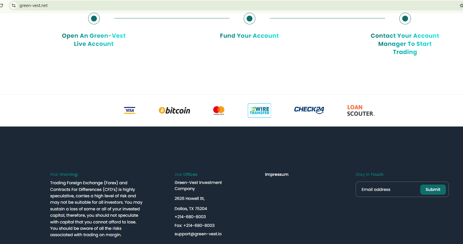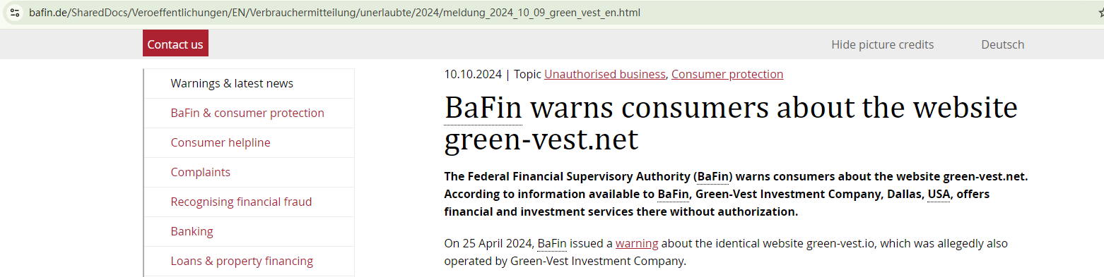 The company operating Green Vest is anonymous, and the website for it doesn't provide any valid regulatory information to substantiate its legitimacy. In addition, the Federal Financial Supervisory Authority (BaFin) has issued a warning about Green Vest for the lack of the proper authorization.