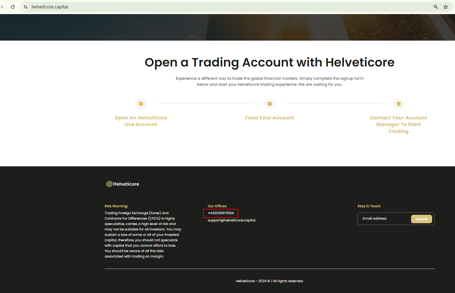 Helveticore fails to disclose any information regarding its regulatory status, which is often considered a scam indicator.It lists a UK phone number as its customer service hotline, suggesting a potential UK office. For it to be a legitimate forex broker in the UK, it must be authorized by the Financial Conduct Authority (FCA). However, our search for the company on the FCA register didn't yield any matching entries.What's more, the Comisión Nacional del Mercado de Valores (CNMV) has added Helveticore to its warning list for providing investment services without authorization.In essence, Helveticore is not regulated by any governing body. Entrusting it with investors' funds is highly risky, as there are no legal protections in place to safeguard the funds.Helveticore appears to be a scam.
