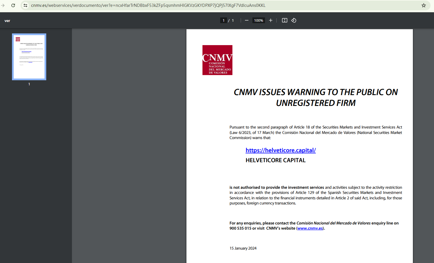 What's more, the Comisión Nacional del Mercado de Valores (CNMV) has added Helveticore to its warning list for providing investment services without authorization.