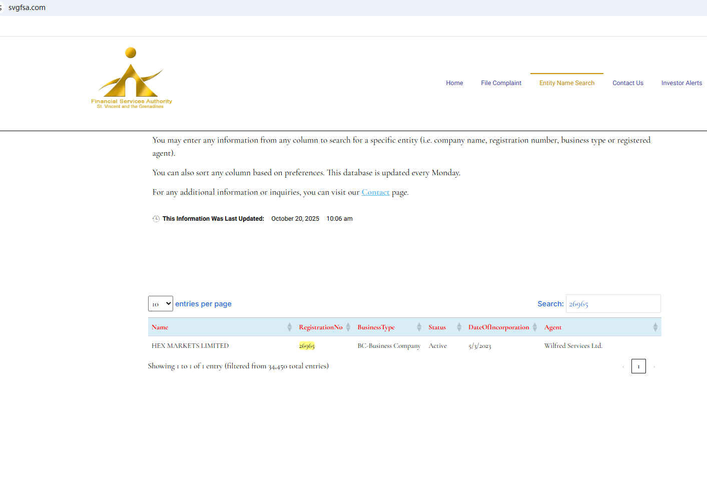 HexMarkets claims to be registered with the St. Vincent and the Grenadines Financial Services Authority (SVG FSA). While this registration remains valid, the SVG FSA does not have the authority to regulate forex and does not constitute a valid forex license. Furthermore, HexMarkets does not appear to be authorized by any reputable financial regulator, raising serious concerns about potential fraud.