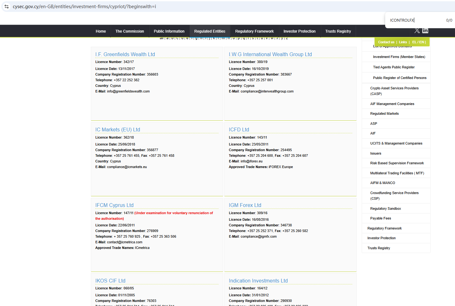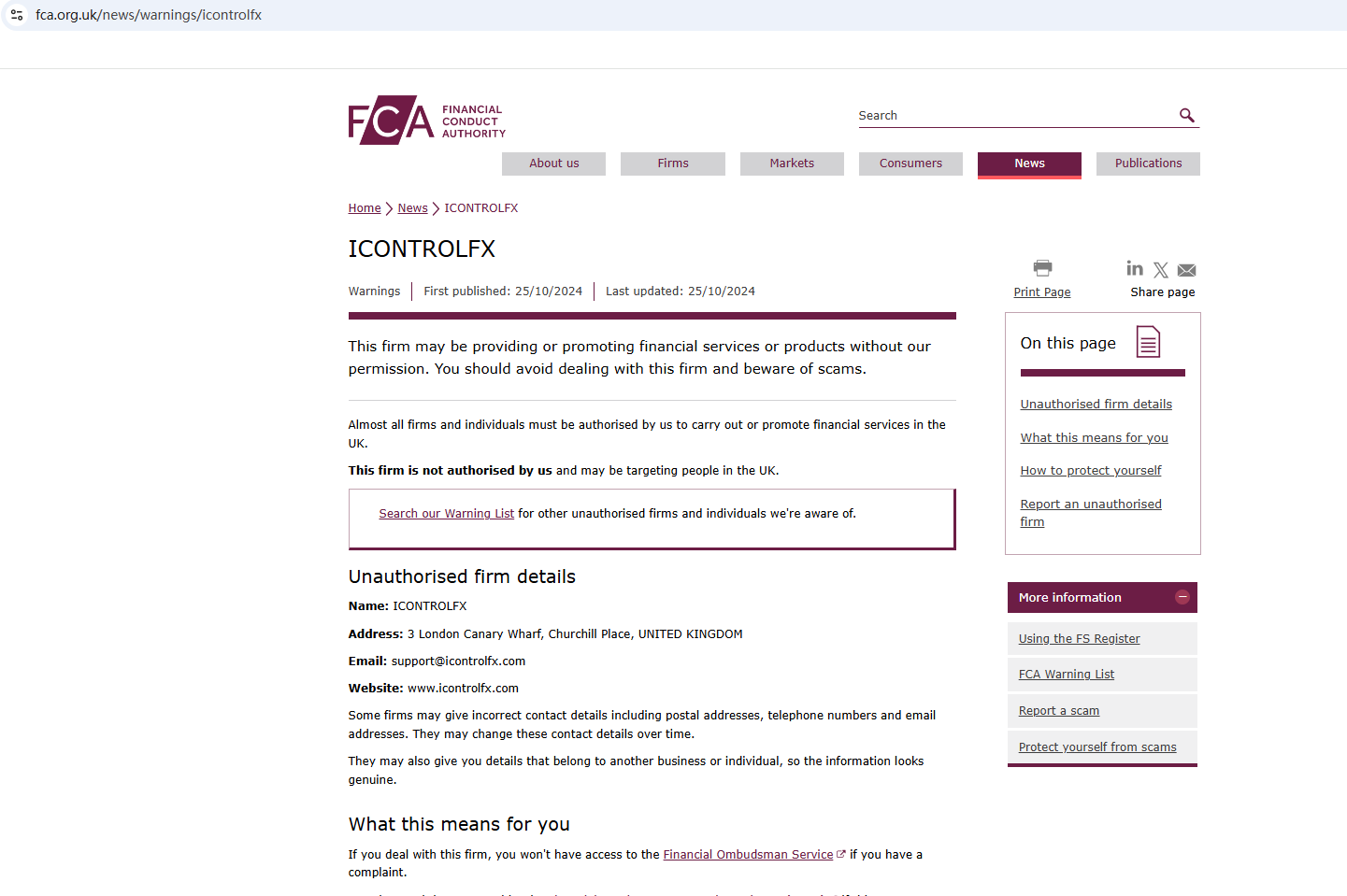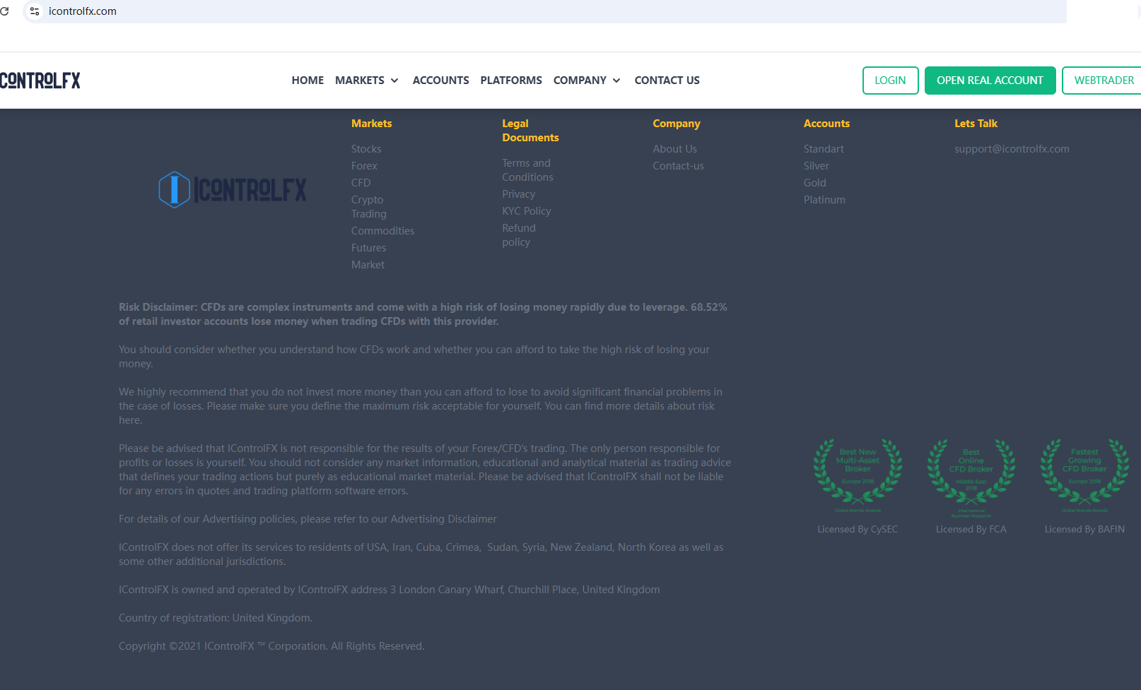 According to its website, it claims to be regulated by the Cyprus Securities and Exchange Commission (CySEC), the Financial Conduct Authority (FCA), and the Federal Financial Supervisory Authority (BaFin). Upon investigation, no matching information was found in the CySEC and BaFin.What's more, we found that the United Kingdom Financial Conduct Authority (FCA) issued a warning against ICONTROLFX, believing this company might be providing financial services or products without authorisation in the UK.In essence, ICONTROLFX is not regulated by any governing body. Entrusting it with investors' funds is highly risky, as there are no legal protections in place to safeguard the funds.ICONTROLFX appears to be a scam.