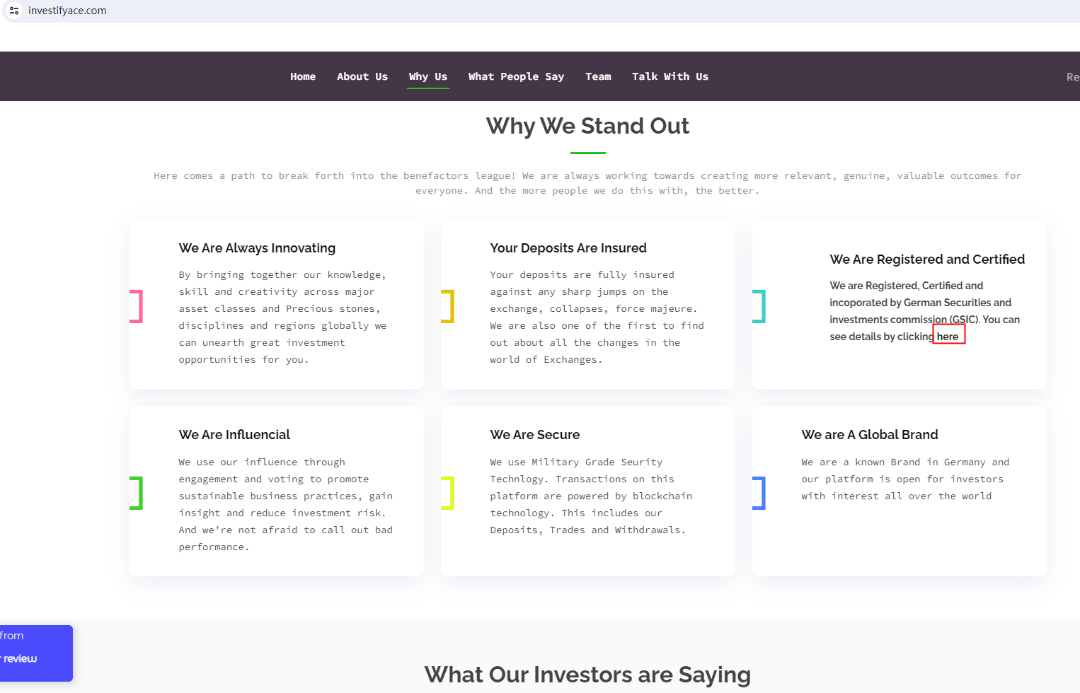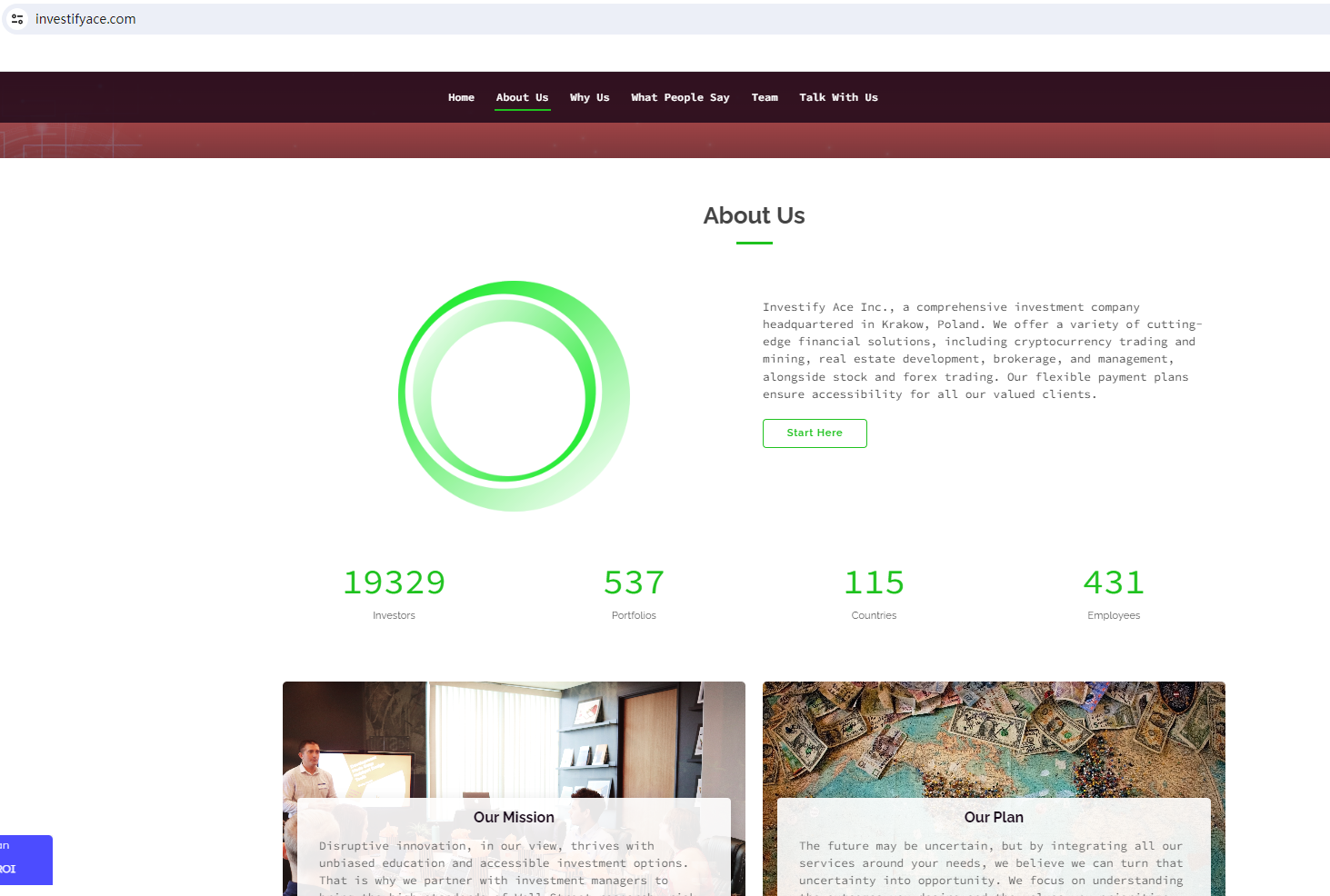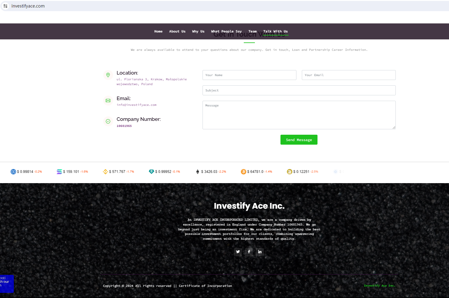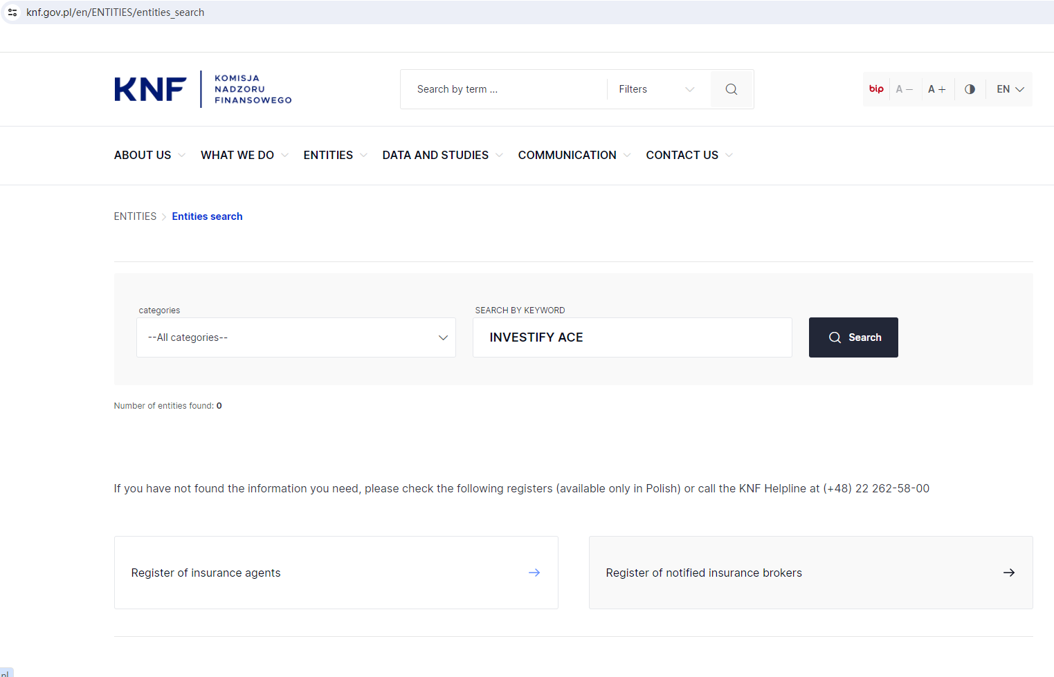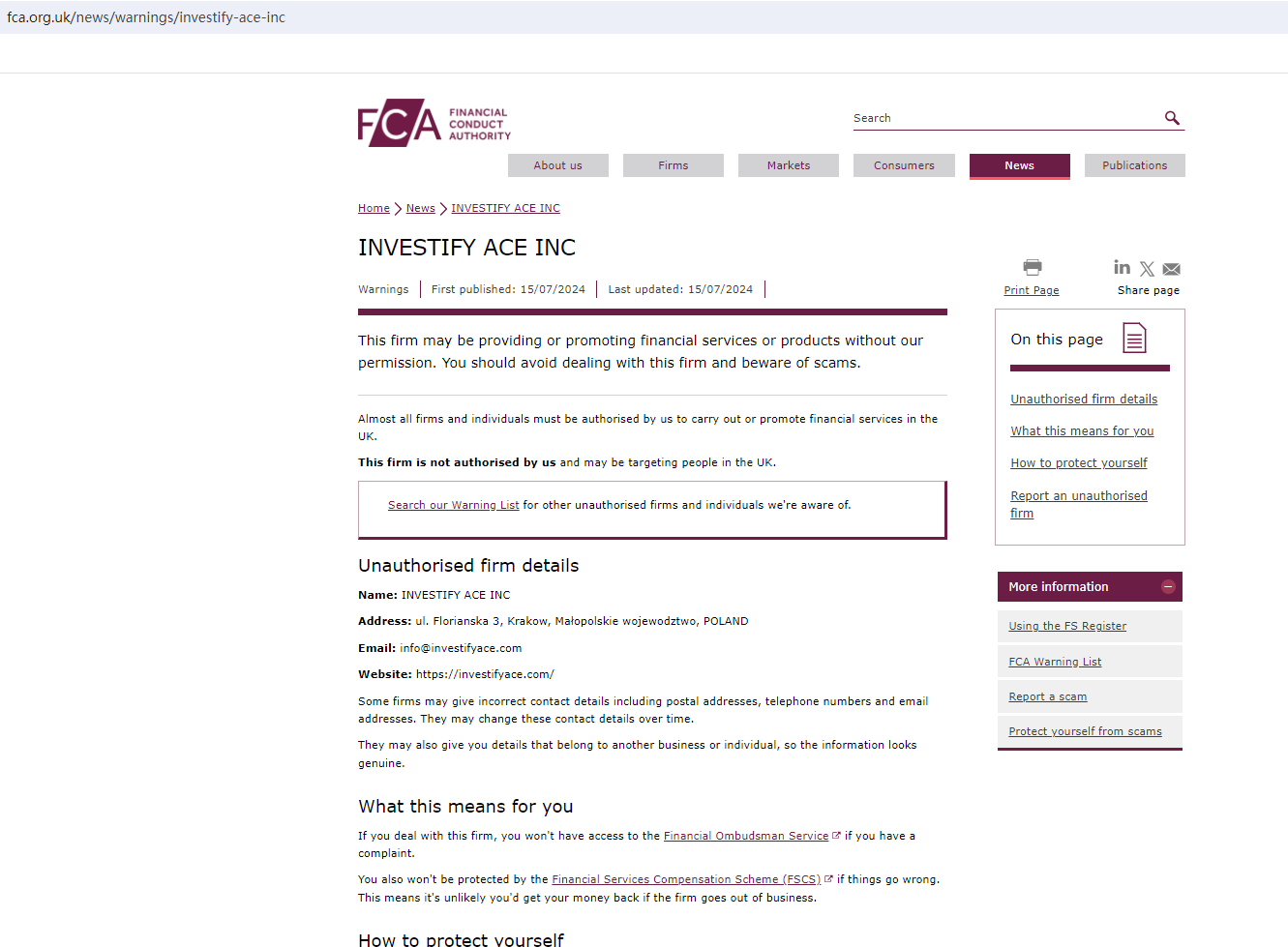 According to its website, its headquarters is in Poland. Upon investigation, no relevant information was found in the Polish Financial Supervision Authority (PFSA). In addition, it mentioned on the webpage that it was regulated by the German Securities and Investments Commission (GSIC) and gave a click-through entrance. After clicking, it was found that the page jumped to the Australia Securities & Investment Commission (ASIC) query page. This is a scam.In addition, it claims registered in the UK. However, we found that the Financial Conduct Authority (FCA) issued a warning against INVESTIFY ACE INC, believing this company might be providing financial services or products without proper authorization in the UK.In essence, INVESTIFY ACE INC is not regulated by any governing body. Entrusting it with investors' funds is highly risky, as there are no legal protections in place to safeguard the funds.INVESTIFY ACE INC appears to be a scam.