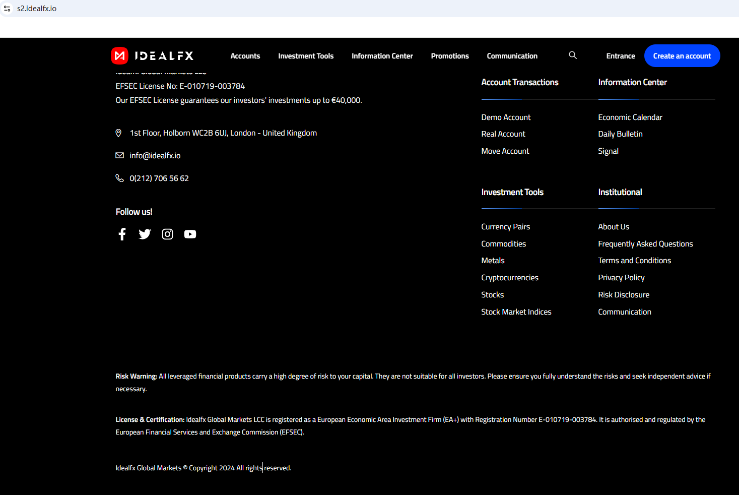 According to its website, it claims to be regulated by the European Financial Services and Exchange Commission (EFSEC). We searched the EFSEC website. We found that the website was established in 2022, and there was not enough relevant information on the Internet. There was no strong evidence to prove that it was a legitimate institution, and its credibility was questionable. In addition, we checked ESMA and did not find any matching information with Idealfx Global Markets in the European Securities and Markets Authority (ESMA). Furthermore, its address is in the UK, and there is no relevant information about Idealfx Global Markets in the Financial Conduct Authority (FCA).In essence, Idealfx Global Markets is not regulated by any governing body. Entrusting it with investors' funds is highly risky, as there are no legal protections in place to safeguard the funds.Idealfx Global Markets appears to be a scam.