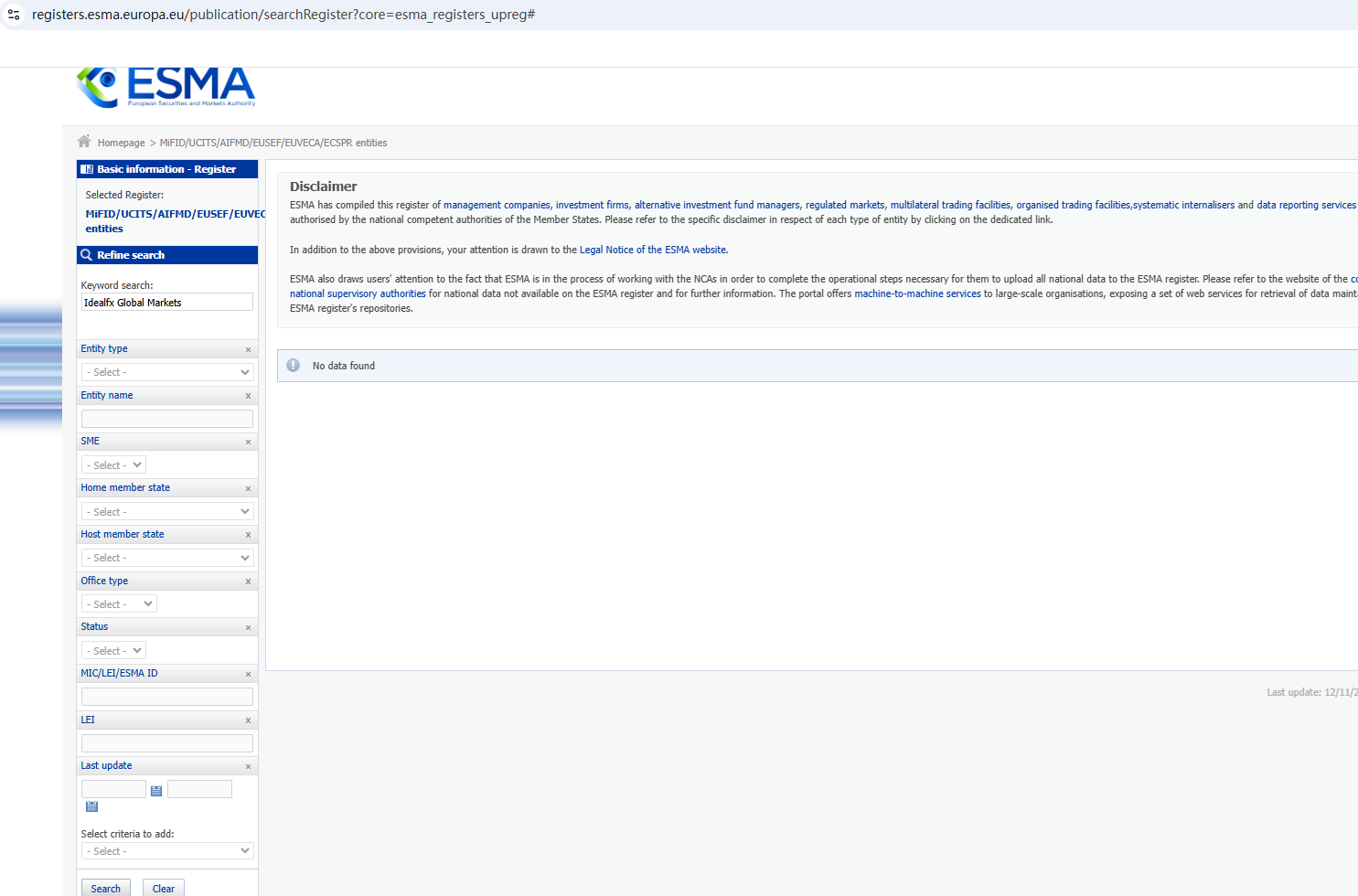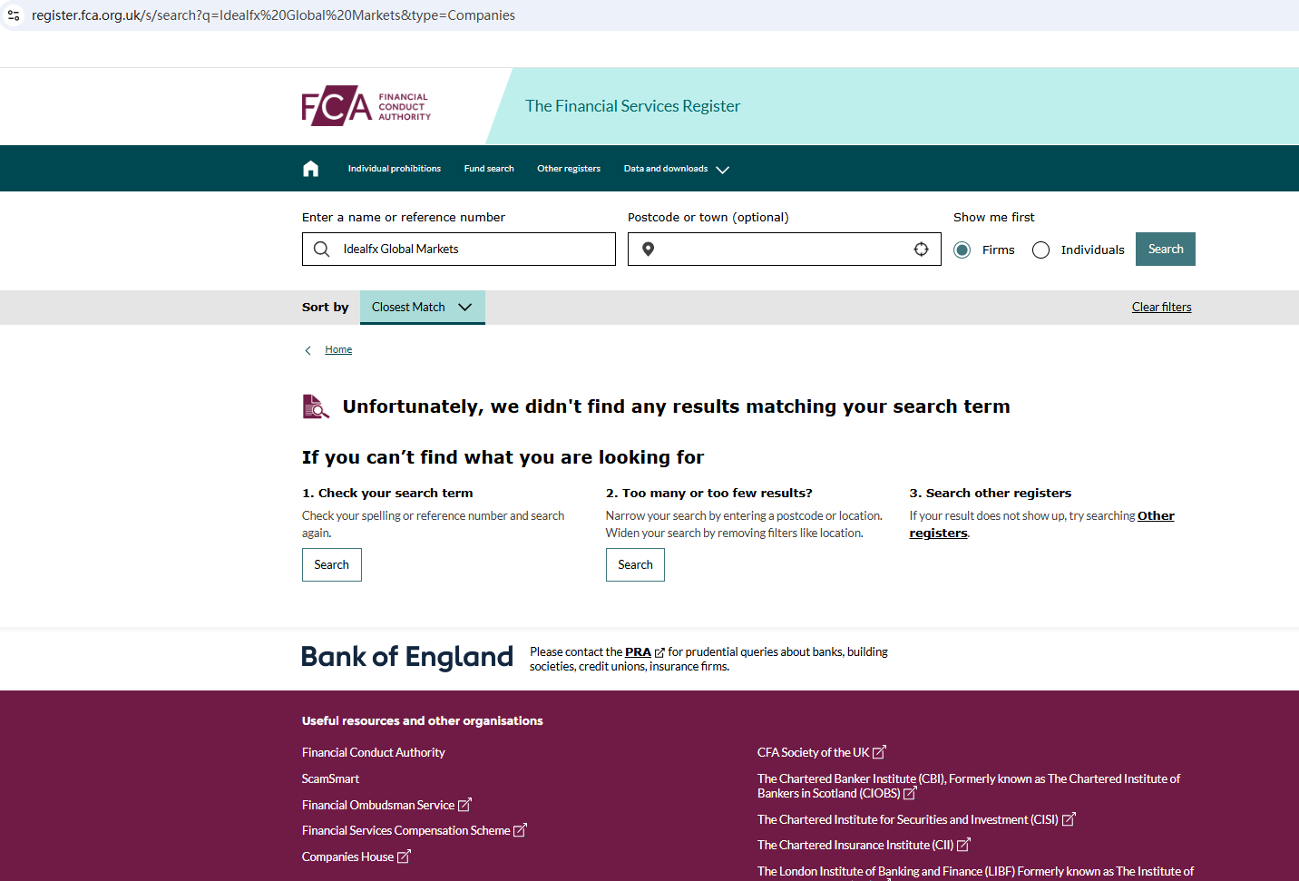 According to its website, it claims to be regulated by the European Financial Services and Exchange Commission (EFSEC). We searched the EFSEC website. We found that the website was established in 2022, and there was not enough relevant information on the Internet. There was no strong evidence to prove that it was a legitimate institution, and its credibility was questionable. In addition, we checked ESMA and did not find any matching information with Idealfx Global Markets in the European Securities and Markets Authority (ESMA). Furthermore, its address is in the UK, and there is no relevant information about Idealfx Global Markets in the Financial Conduct Authority (FCA).