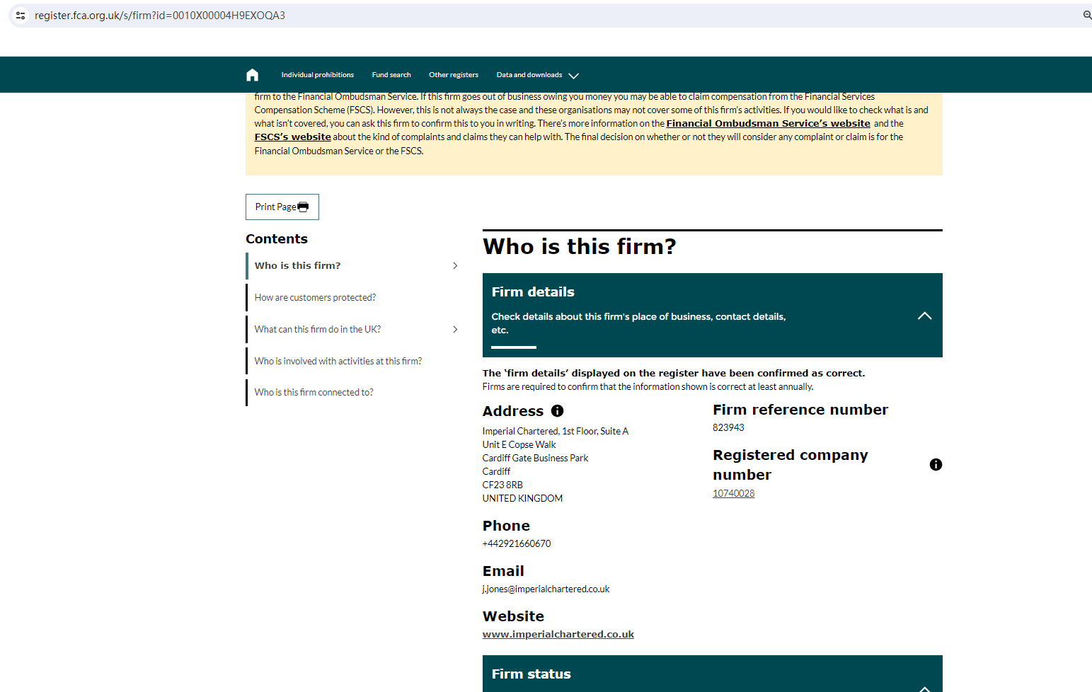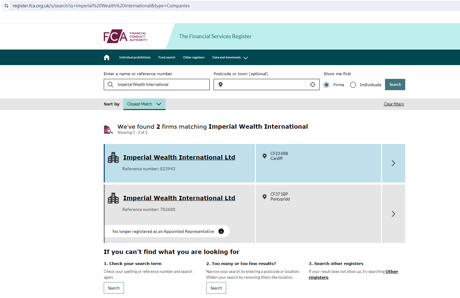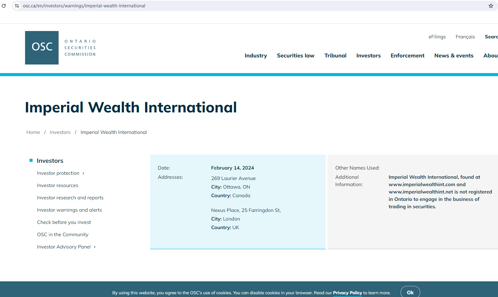 According to its website, it displays two addresses. One is located in the United Kingdom. Upon investigation, we found similar companies in the Financial Conduct Authority (FCA) through the company name. However, after careful comparison, we found that their websites and addresses did not match Imperial Wealth International. Obviously, Imperial Wealth International is not regulated by the FCA. The other one is located in Ottawa. After searching, it was found that no matching information was found in the Investment Industry Regulatory Organization of Canada (IIROC).In addition, the Ontario Securities Commission (OSC) issued a warning that Imperial Wealth International was providing financial services or products without authorisation.The truth is that Imperial Wealth International is not regulated by any regulators. Letting it hold or control investors' money is unsafe, and the money can not be protected by any laws.Imperial Wealth International is a scam.