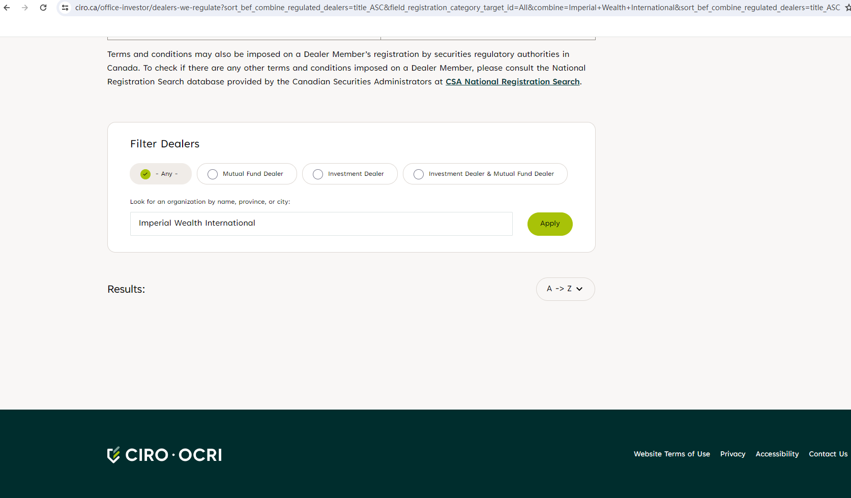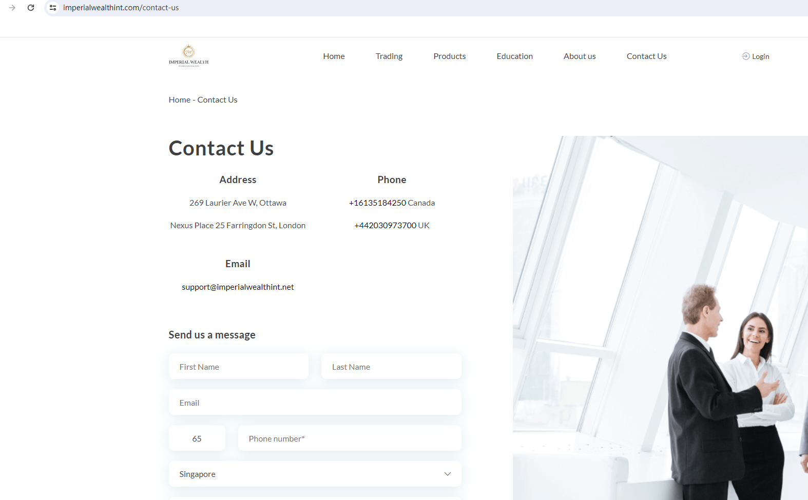 According to its website, it displays two addresses. One is located in the United Kingdom. Upon investigation, we found similar companies in the Financial Conduct Authority (FCA) through the company name. However, after careful comparison, we found that their websites and addresses did not match Imperial Wealth International. Obviously, Imperial Wealth International is not regulated by the FCA. The other one is located in Ottawa. After searching, it was found that no matching information was found in the Investment Industry Regulatory Organization of Canada (IIROC).