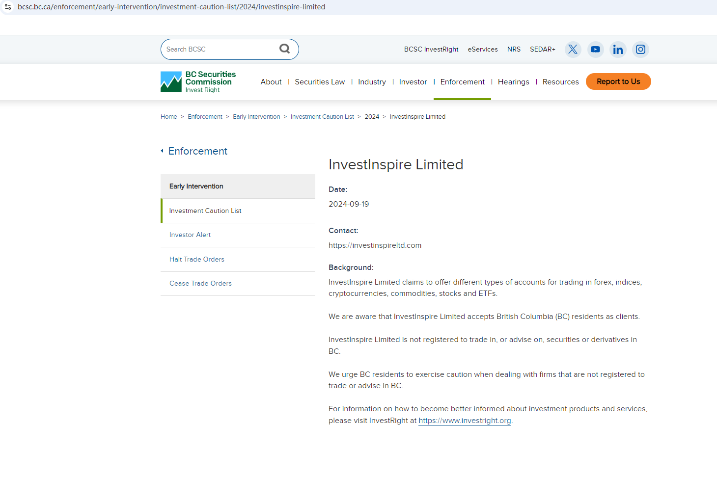 In addition, the British Columbia Securities Commission (BCSC) issued a warning against InvestInspire Limited, identifying it as an unauthorized firm.