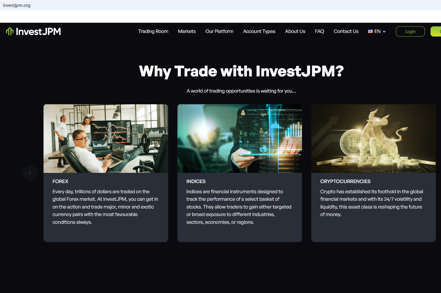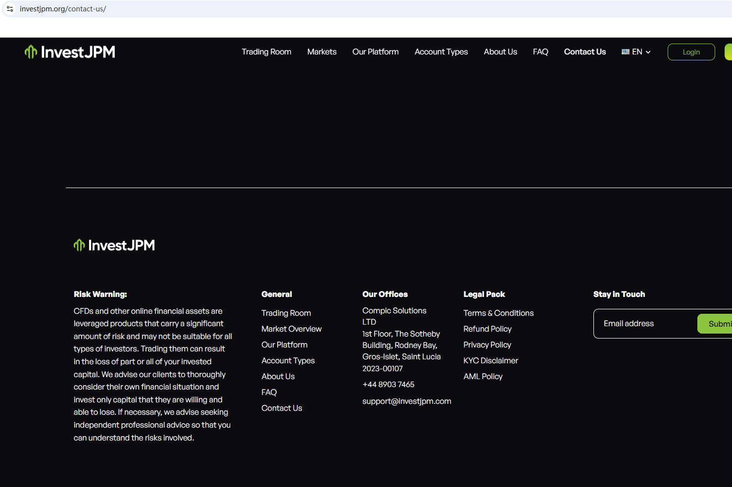 The website it uses is a special template for scam websites and has been marked by Brokersview many times. Although it claims to be located in Saint Lucia, it is well known that Saint Lucia does not regulate foreign exchange. Furthermore, it does not display any other valid regulatory information on the website for investors to inquire. This is very unreliable, so investors should be careful when identifying it.In addition, the Financial Conduct Authority (FCA) warned against InvestJPM, believing this company might be providing financial services or products without proper authorization in the UK.In essence, InvestJPM is not regulated by any governing body. Entrusting it with investors' funds is highly risky, as there are no legal protections in place to safeguard the funds.InvestJPM appears to be a scam.