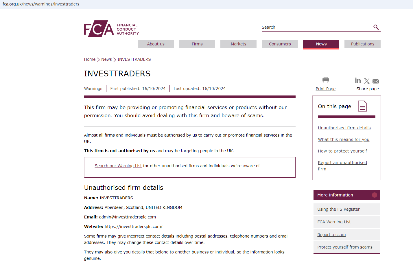 • Oct 15, 2024 The UK FCA issued a Warning against INVESTTRADERS