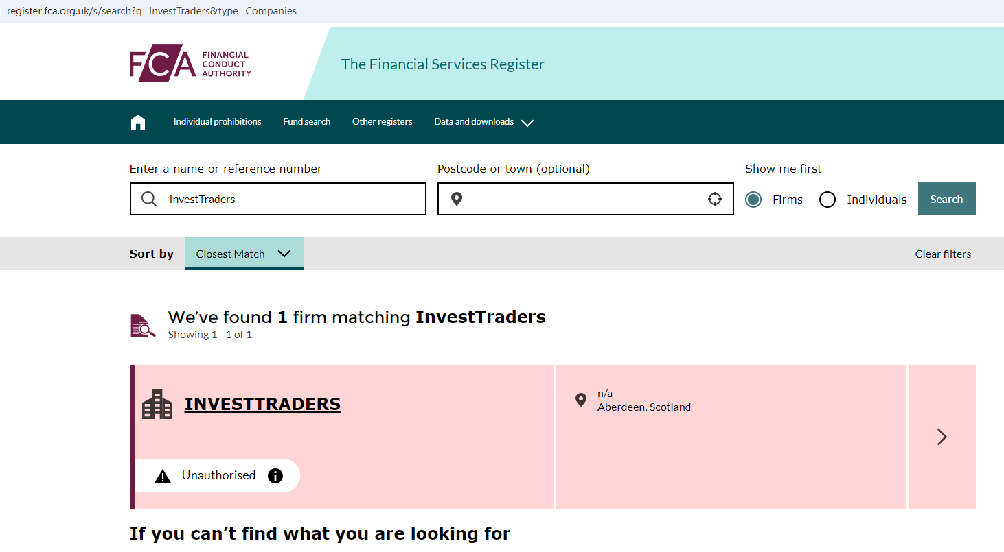 Upon investigation, we found that InvestTraders is not authorized and regulated by the United Kingdom Financial Conduct Authority (FCA). The United Kingdom Financial Conduct Authority (FCA) issued a warning against INVESTTRADERS, believing this company might be providing financial services or products without authorisation in the UK.