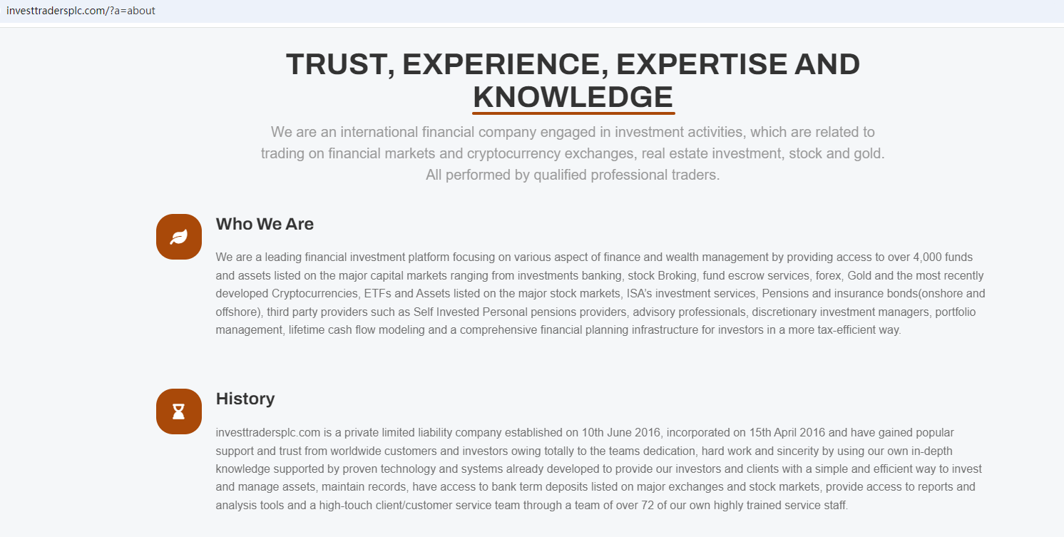 Investtradersplc.com claims to be a financial investment platform located in the UK,