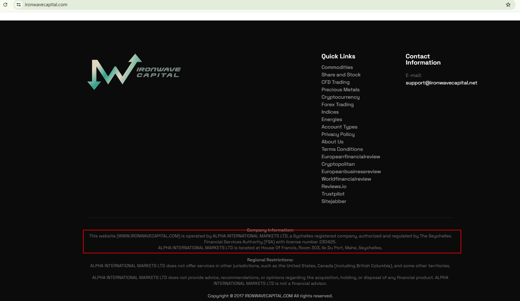 Ironwave Capital claims to be operated by ALPHA INTERNATIONAL MARKETS LTD, which alleges to be authorized and regulated by The Seychelles Financial Services Authority (FSA) with license number 230425. However, the number it claims is suspicious because the typical form of Seychelles FSA's Securities Dealers licenses starts with "SD". We conducted a search in the authority's register, but no corresponding records were found, suggesting that the purported license is fake.