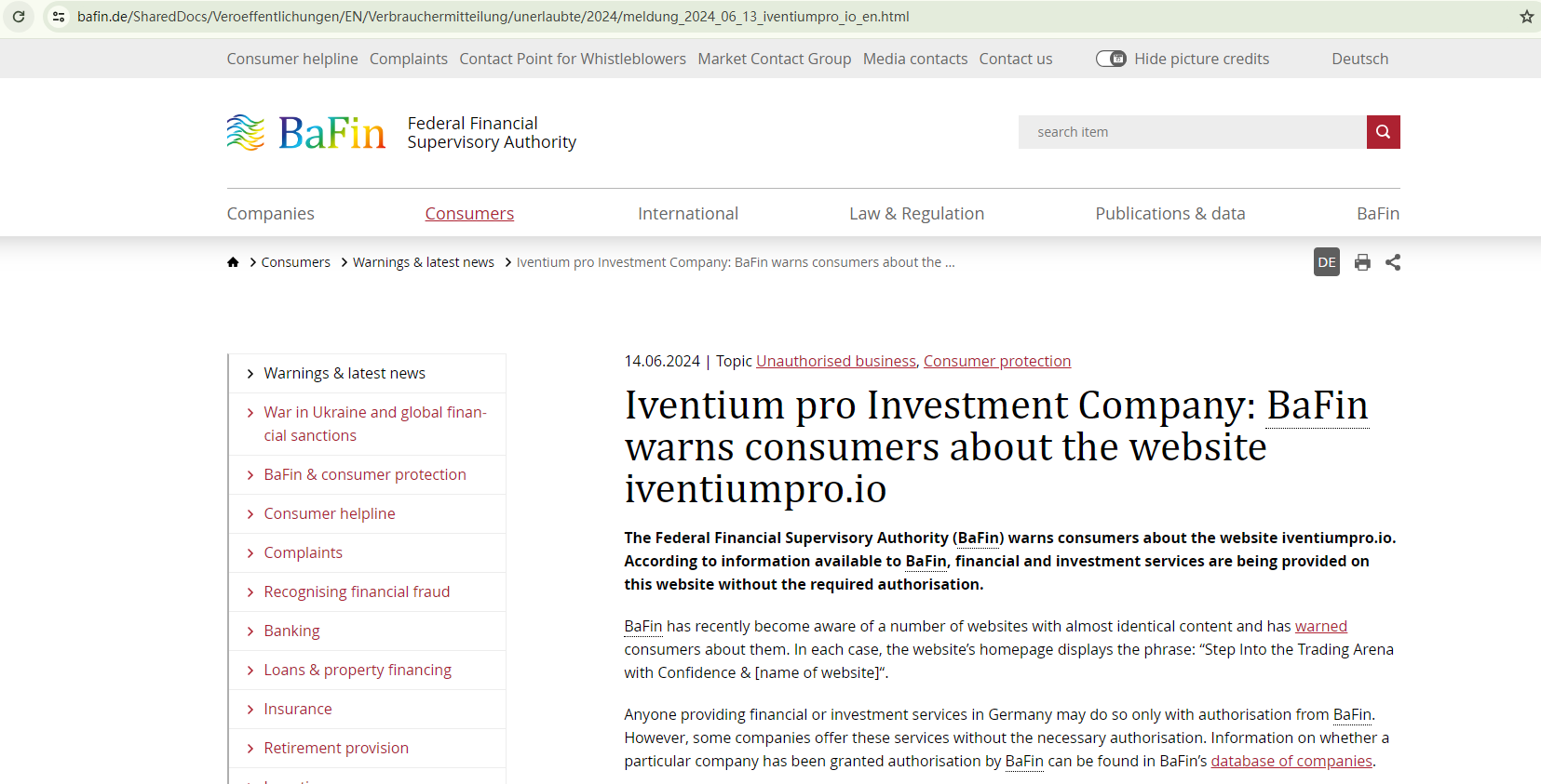 Furthermore, the Federal Financial Supervisory Authority (BaFin) has issued a warning that IventiumPRO is offering financial and investment services without the necessary authorization. This alert is a strong indication of the broker's non-compliance.