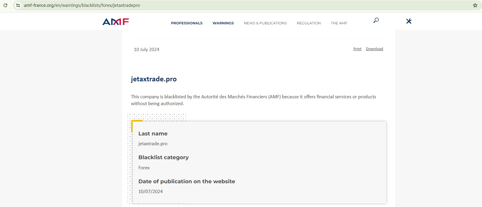 In addition, the Financial Authority (Autorité des Marchés Financiers, AMF) added JetaxTrade to warning list for it being an unauthorized company engaging in forex activities.