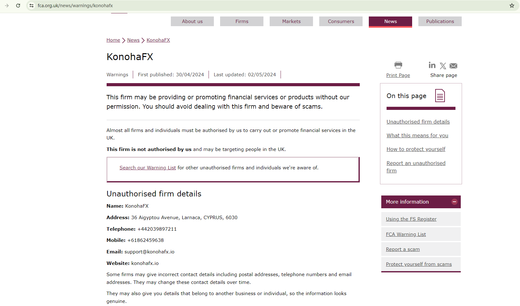 • Apr 29, 2024 The FCA issues a warning against KonohaFX