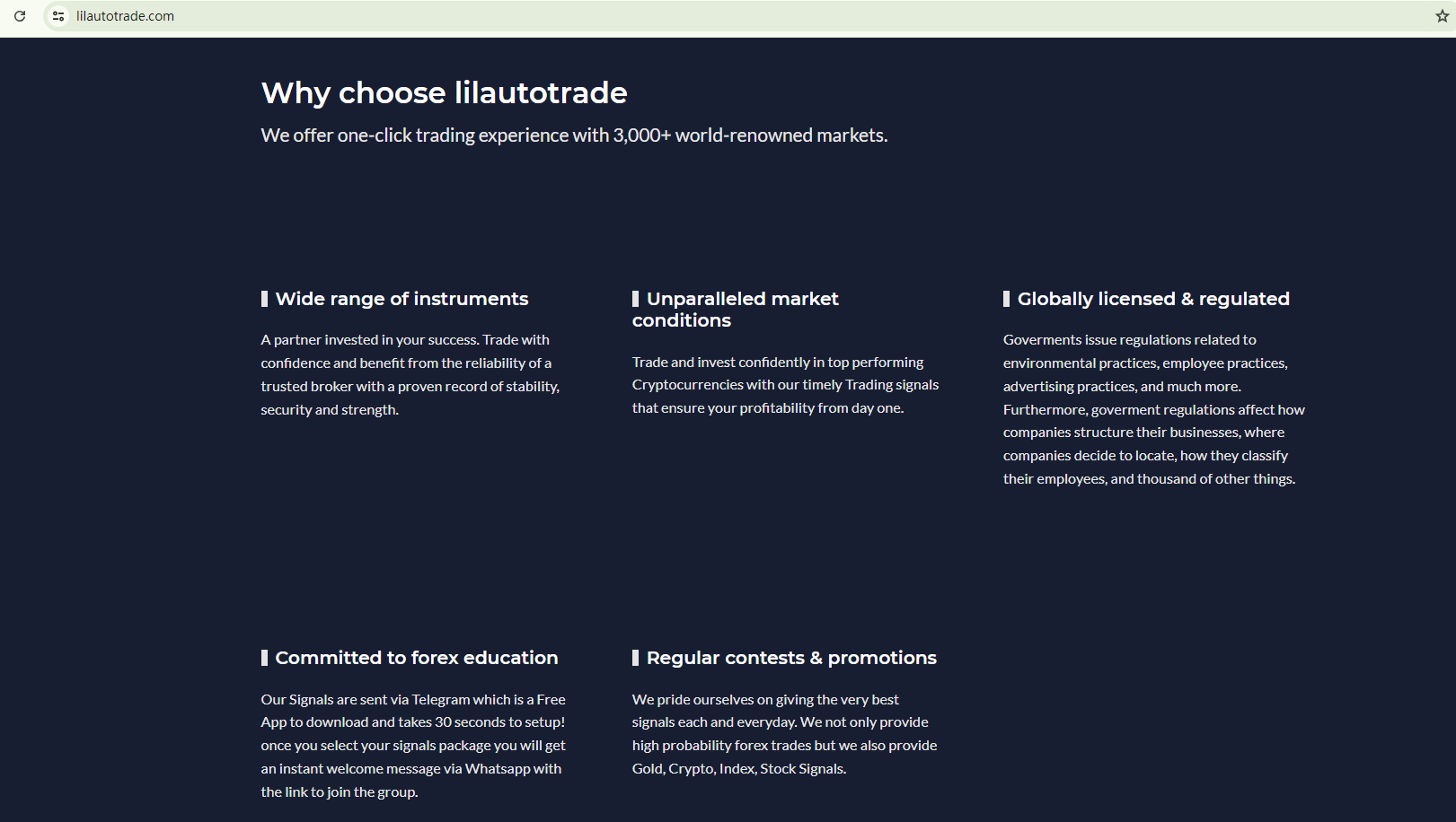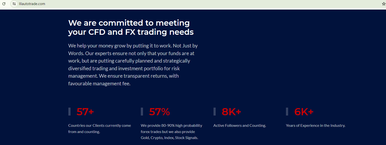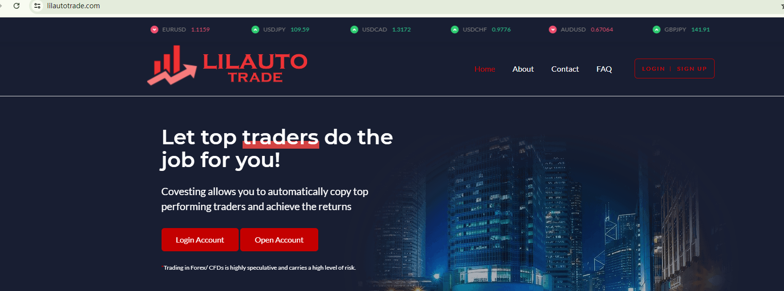 LILAUTO TRADE's website utilizes a template frequently linked to fraudulent schemes, which offers prewritten content and simple graphics for rapid, seemingly professional site creation.Despite its UK-based claims, LILAUTO TRADE has been warned by the Financial Conduct Authority (FCA) for operating without the necessary authorization.In essence, LILAUTO TRADE is not regulated by any governing body. Entrusting it with investors' funds is highly risky, as there are no legal protections in place to safeguard the funds.LILAUTO TRADE appears to be a scam.