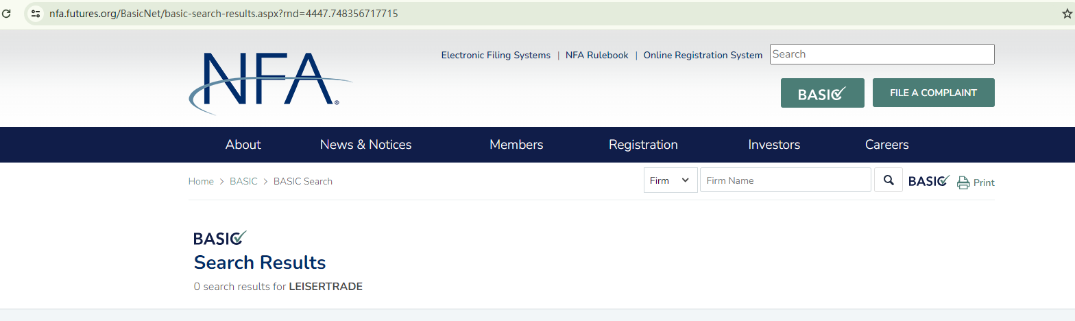 While it purports to be located in the US, Leisertrade fails to be a member of the National Futures Association (NFA) and thus is not subject to its oversight.
