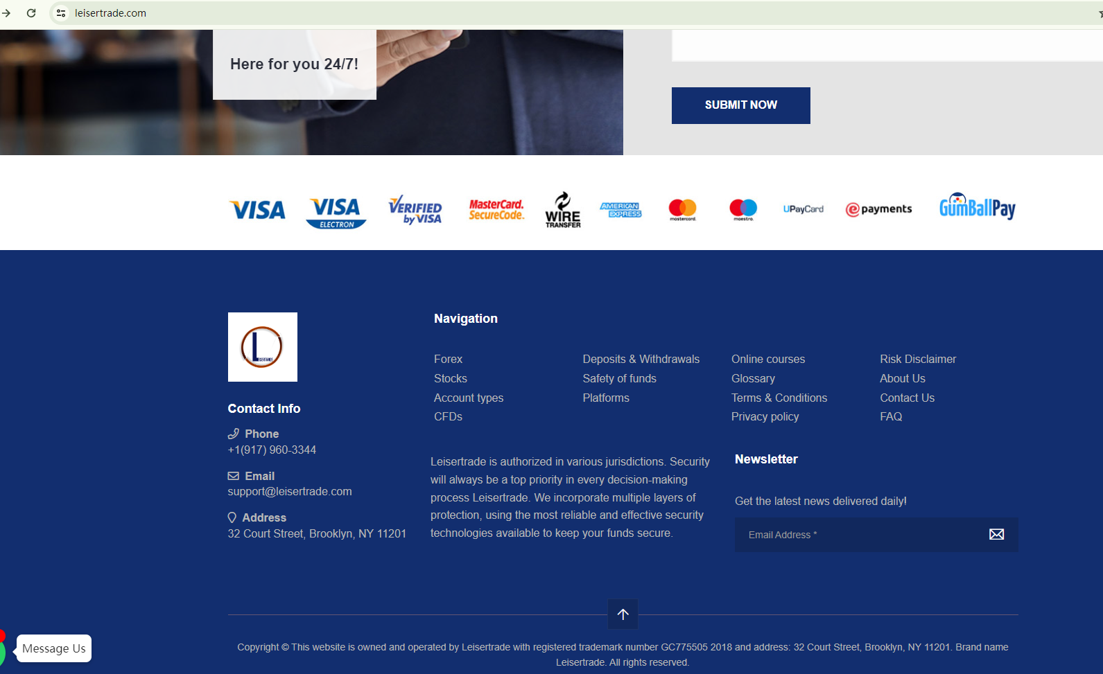 Leisertrade claims to be authorized in various jurisdictions, yet fails to provide any specific licensing information. Without solid evidence of its legitimacy, such claims are not trustworthy.While it purports to be located in the US, Leisertrade fails to be a member of the National Futures Association (NFA) and thus is not subject to its oversight. In essence, Leisertrade is not regulated by any governing body. Entrusting it with investors' funds is highly risky, as there are no legal protections in place to safeguard the funds.Leisertrade appears to be a scam.