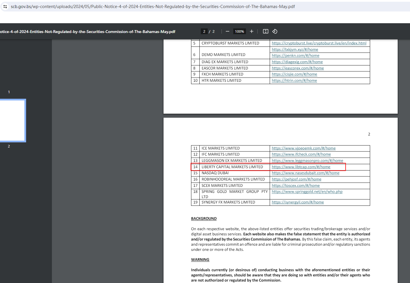 The most compelling evidence comes when the Securities Commission of the Bahamas (SCB) adds Liberty Capital Markets to its warning list, refuting the broker's false claims of being regulated by them.