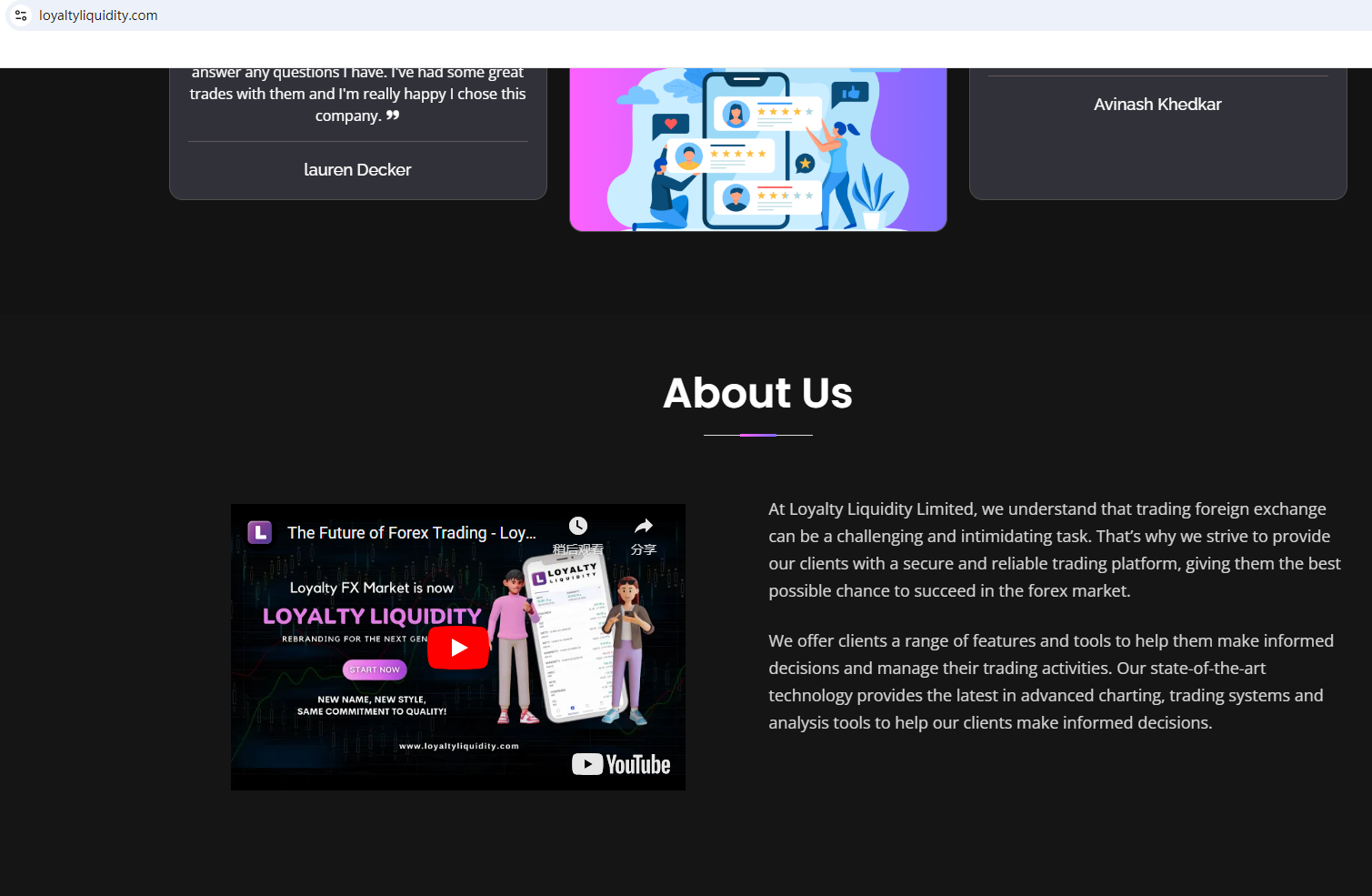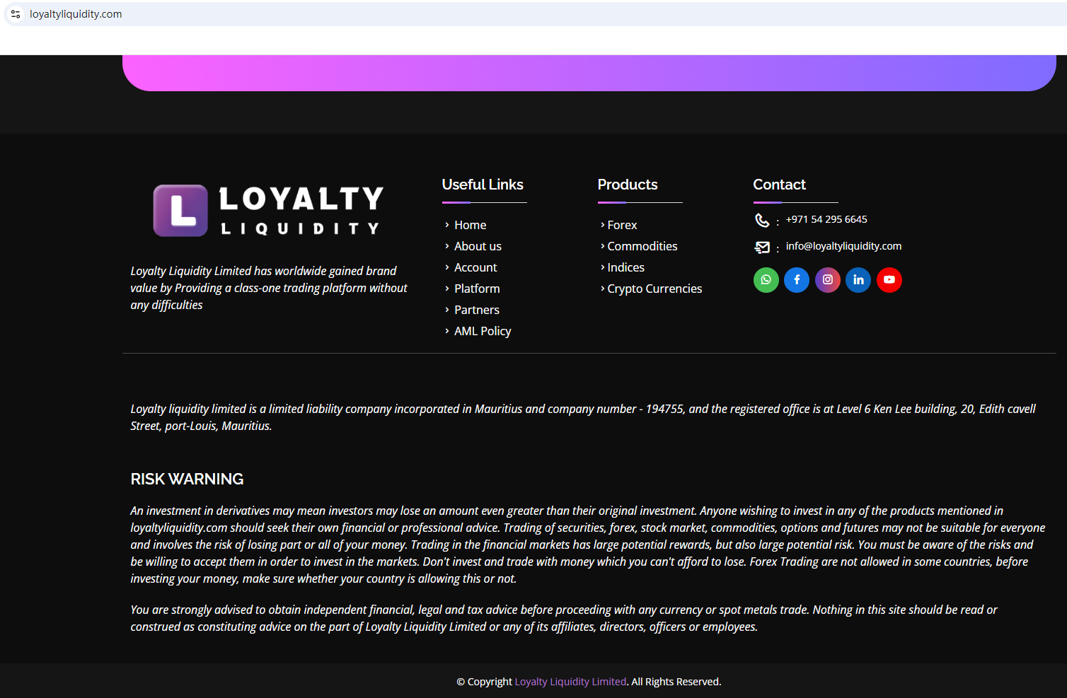 According to its website, it is incorporated in Mauritius. Upon investigation, no matching information was found in the Financial Services Commission, Mauritius (the 'FSC Mauritius').Therefore, Loyalty Liquidity Limited is not regulated at all. Entrusting it with investors' funds is highly risky, as there are no legal protections in place to safeguard the funds.Loyalty Liquidity Limited appears to be a scam.