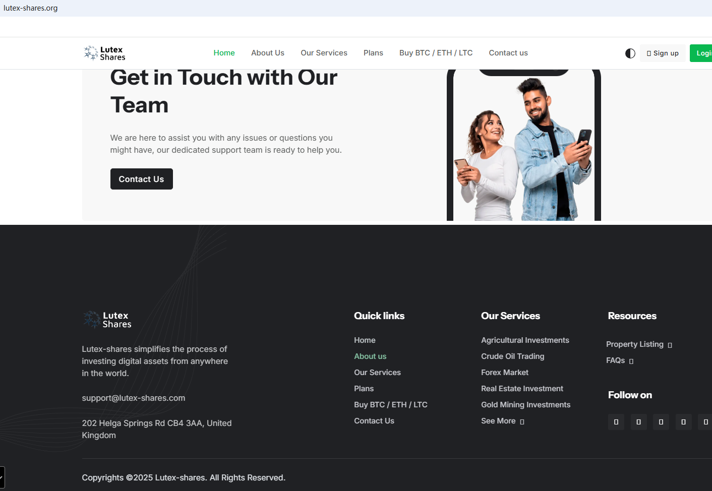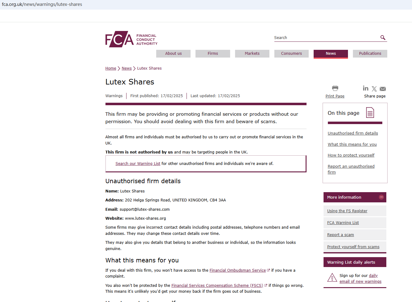 First, it claims to be established in 2018, but upon investigation, we found that the domain name was not established until 2025. Secondly, it claims to be a reliable company with the right to exercise foreign exchange, but it does not display any valid foreign exchange regulatory certificates on the website, which is also questionable. Finally, it is located in the UK. we found that the Financial Conduct Authority (FCA) issued a warning against Lutex Shares, believing this company might be providing financial services or products without proper authorization in the UK.