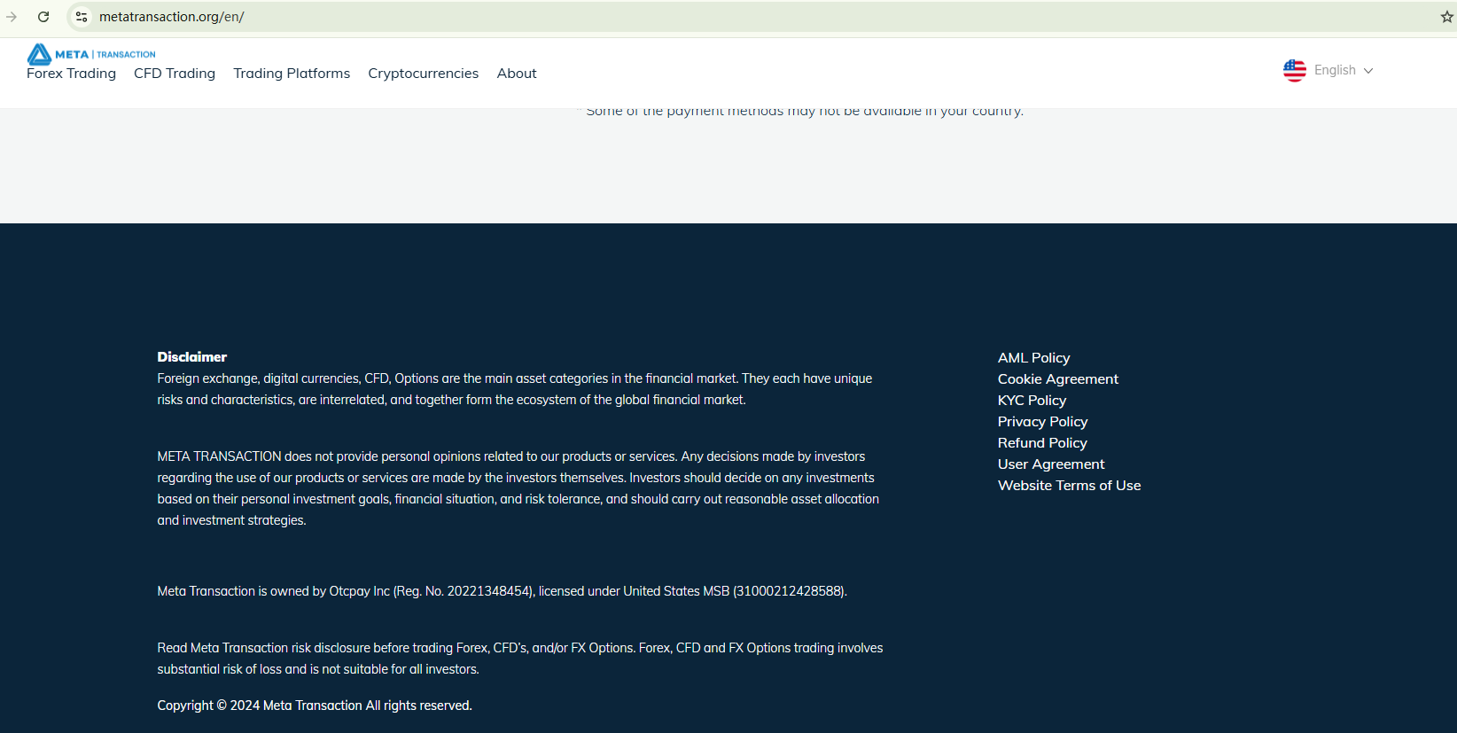 META TRANSACTION claims to have been established in 2007. However, the domain registration date, recently created in May 2024, contradicts this claim and raises a red flag. The company asserts its US domicile, relying solely on an alleged MSB registration with the Financial Crimes Enforcement Network (FinCEN) for legitimacy. It is critical to note that META TRANSACTION's activities should be regulated by the National Futures Association (NFA) and the Commodity Futures Trading Commission (CFTC). In addition, FinCEN has stated that MSB registration does not constitute endorsement by any government agency and does not verify the information submitted by registrants. Our search found no corresponding records in the NFA's registry, indicating that META TRANSACTION is operating without a license and is not overseen by regulatory authorities in the US.