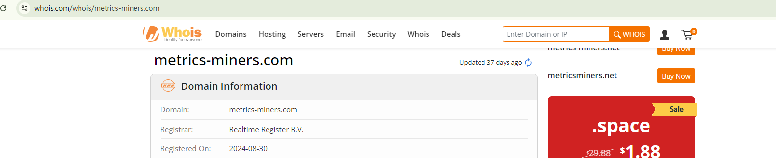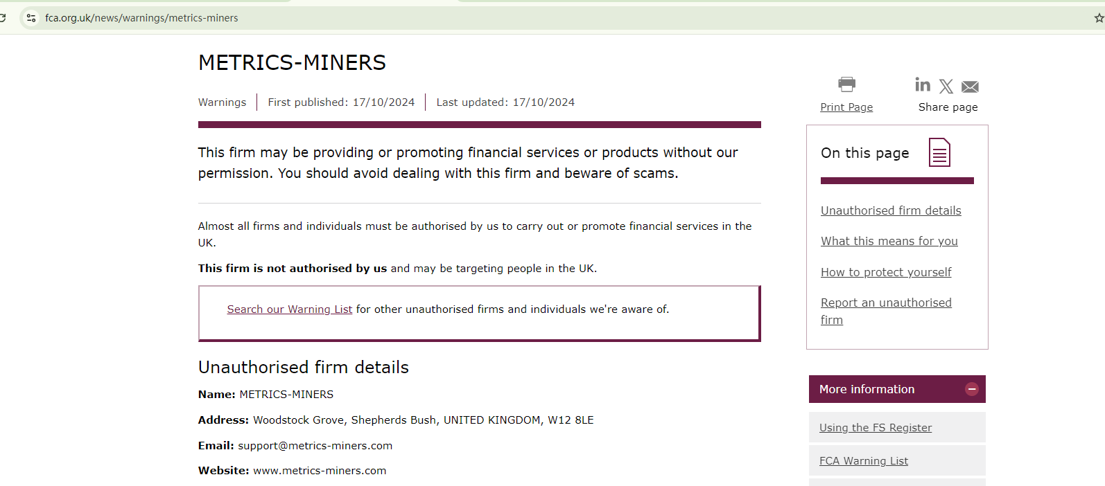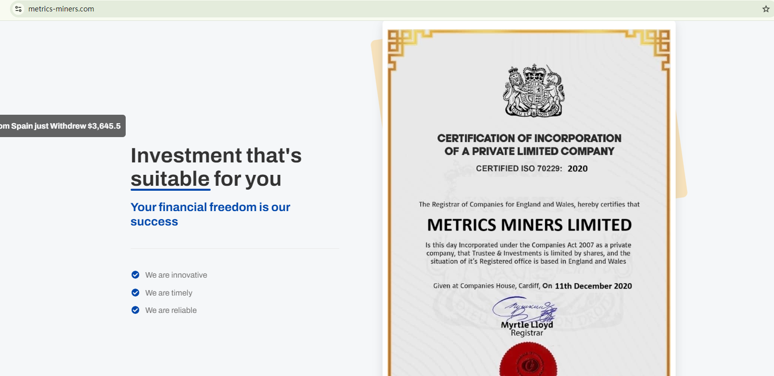 The website of METRICS MINERS is relatively new, with its registration dating back to the end of August, 2024. It promises unreasonably high daily returns, which is a clear indicator of a scam. METRICS MINERS uses a fake company incorporation certificate allegedly from the Companies House (CH) to appear legitimate. We found no valid licensing information on the trading platform. Additionally, the Financial Conduct Authority (FCA) has issued a warning against METRICS MINERS for operating without the required authorization.In essence, METRICS MINERS is not regulated by any governing body. Entrusting it with investors' funds is highly risky, as there are no legal protections in place to safeguard the funds.METRICS MINERS appears to be a scam.