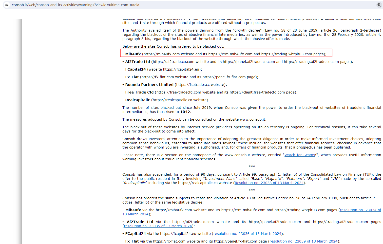 In addition, the Commissione Nazionale per le Società e la Borsa (CONSOB) added MIB40FX to its warning list as a fraudulent trading platform.